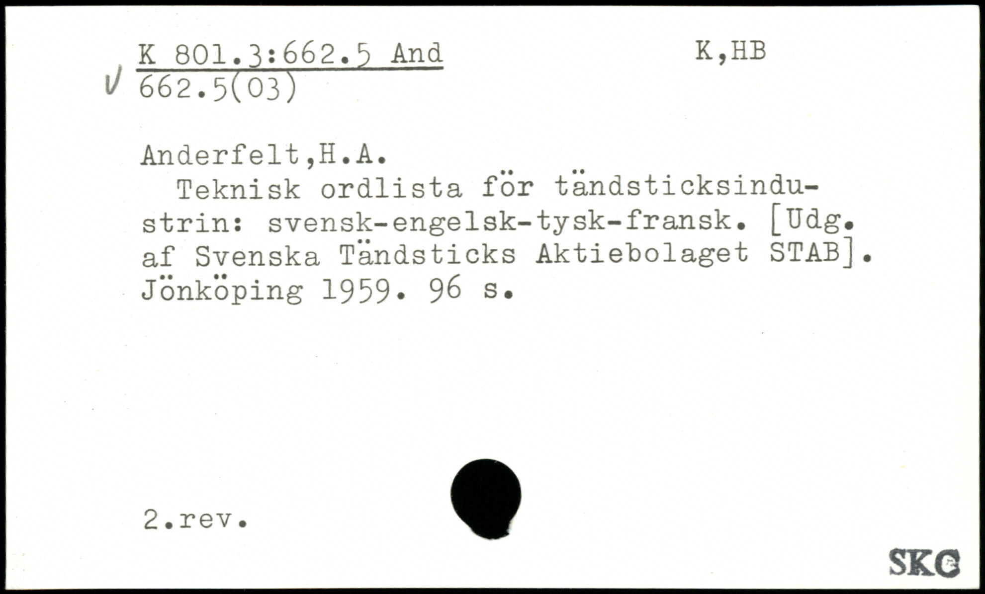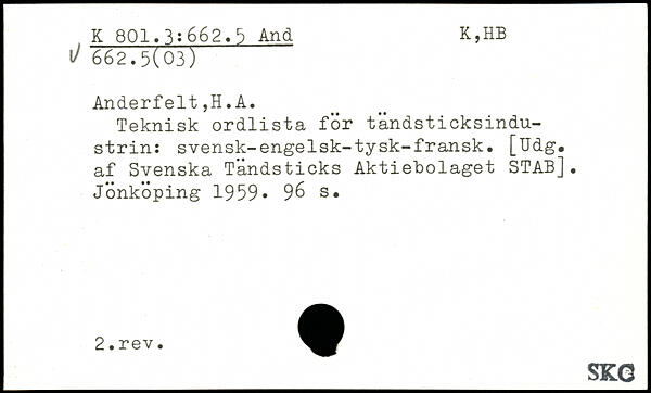 Teknisk ordlista för tändsticksindu-strin: svensk-engelsk-tysk-fransk. [Udg. af Svenska Tändsticks Aktiebolaget STAB], Jönköping 1959