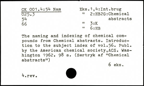 5.. abstracts 66 " 3:K " 6 :HB The naming and indexing of chemical compounds from Chemical abstracts. Introduction to the subject index of