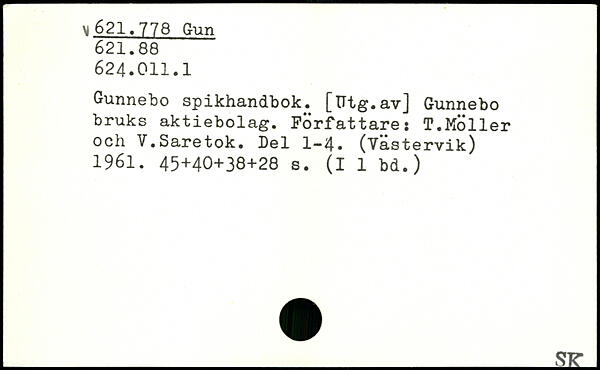 Gunnebo spikhandbok. [Utg.av] Gunnebo bruks aktiebolag. Författare: T.Möller och V.Saretok. Del 1-4. (Yästervik) 1961.