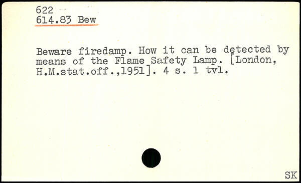 Beware firedamp. How it can Be detected "by means of the Flame Safety Lamp. [London, H.M.stat.off.,1951].