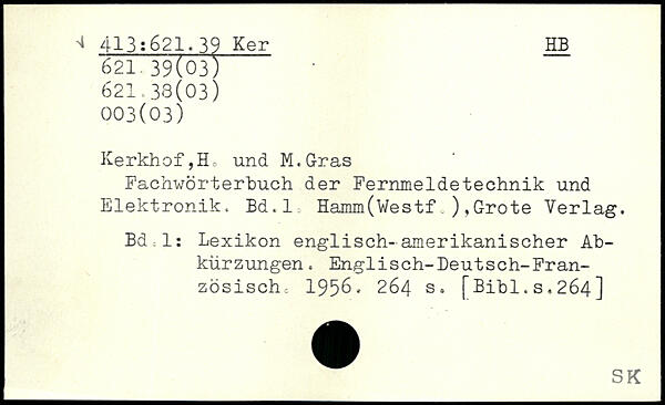 Fachwörterbuch der Fernmeldetechnik und Elektronik. Bd.l Hamm(Westf.),Grote Verlag. Bd l: Lexikon englisch-amerikanischer Abkürzungen. Englisch-Deutsch-Fran- zösischo 1956.