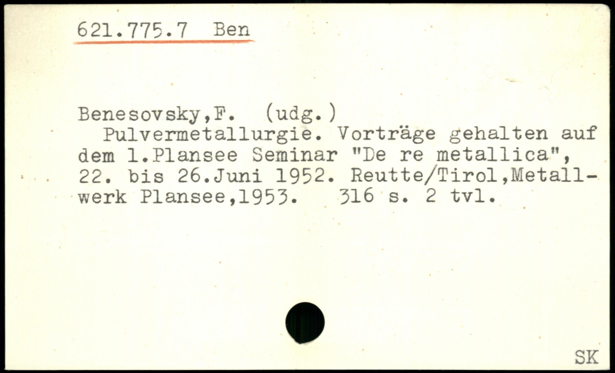 Pulvermetallurgie. Vorträge gehalten auf dem 1.Plansee Seminar "Be re metallica", 22. bis 26.Juni 1952.