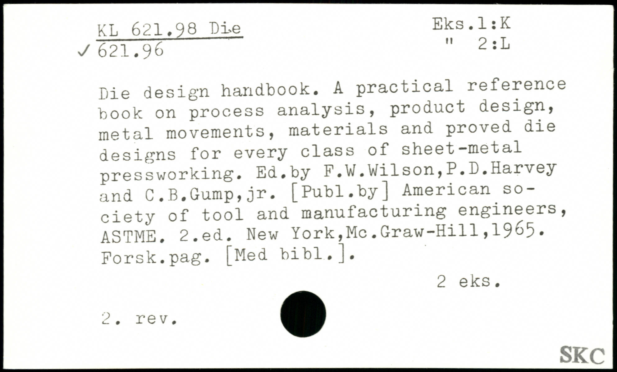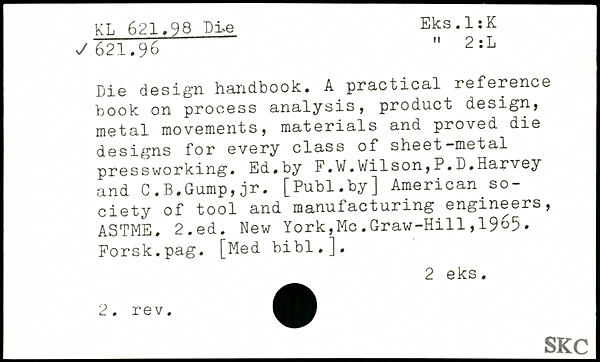 Die design handbook. A practical reference book on process analysis, product design, metal movements, materials and proved die designs for every class of sheet-metal pressworking. Ed.by F,V.Wilson,P.D.Harvey and C.B.Gump,jr.