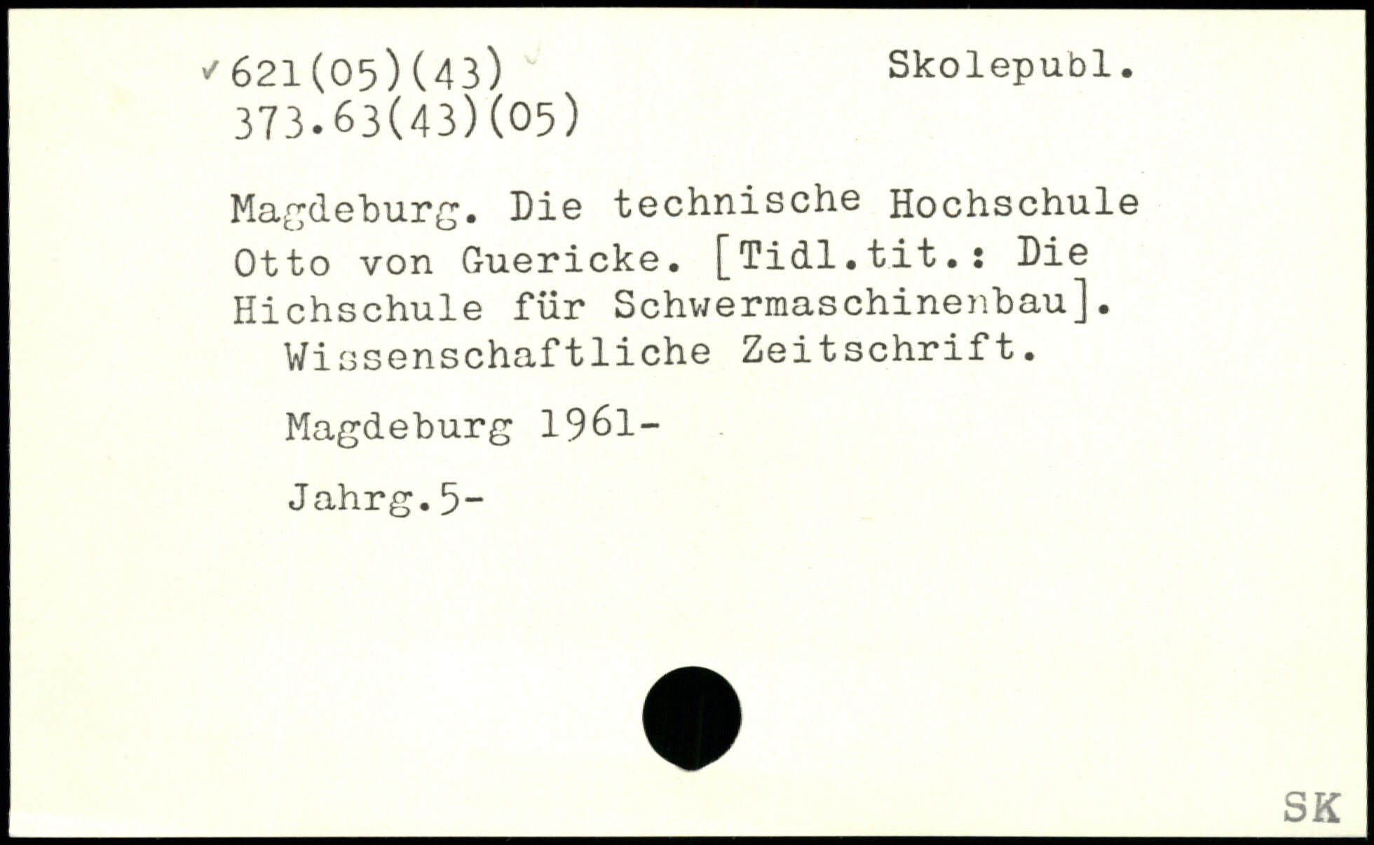 Magdeburg. Die technische Hochschule Otto von Guericke. [Tidl.tit.s Die Hichschule für Schwermaschinenbau]. Wissenschaftliche Zeitschrift. Magdeburg 1961- Jahrg.5-