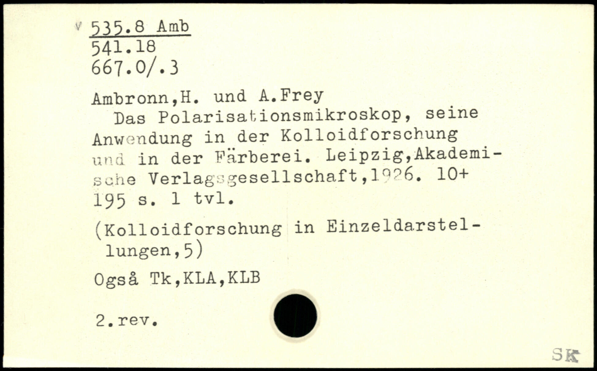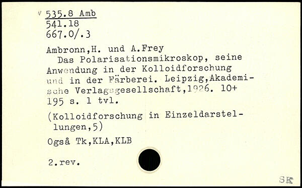 Das Polarisationsmikroskop, seine Anwendung in der Kolloidforschung und in der Färberei. Leipzig,Akademische Verlagsgesellschaft,1.?6. 10+