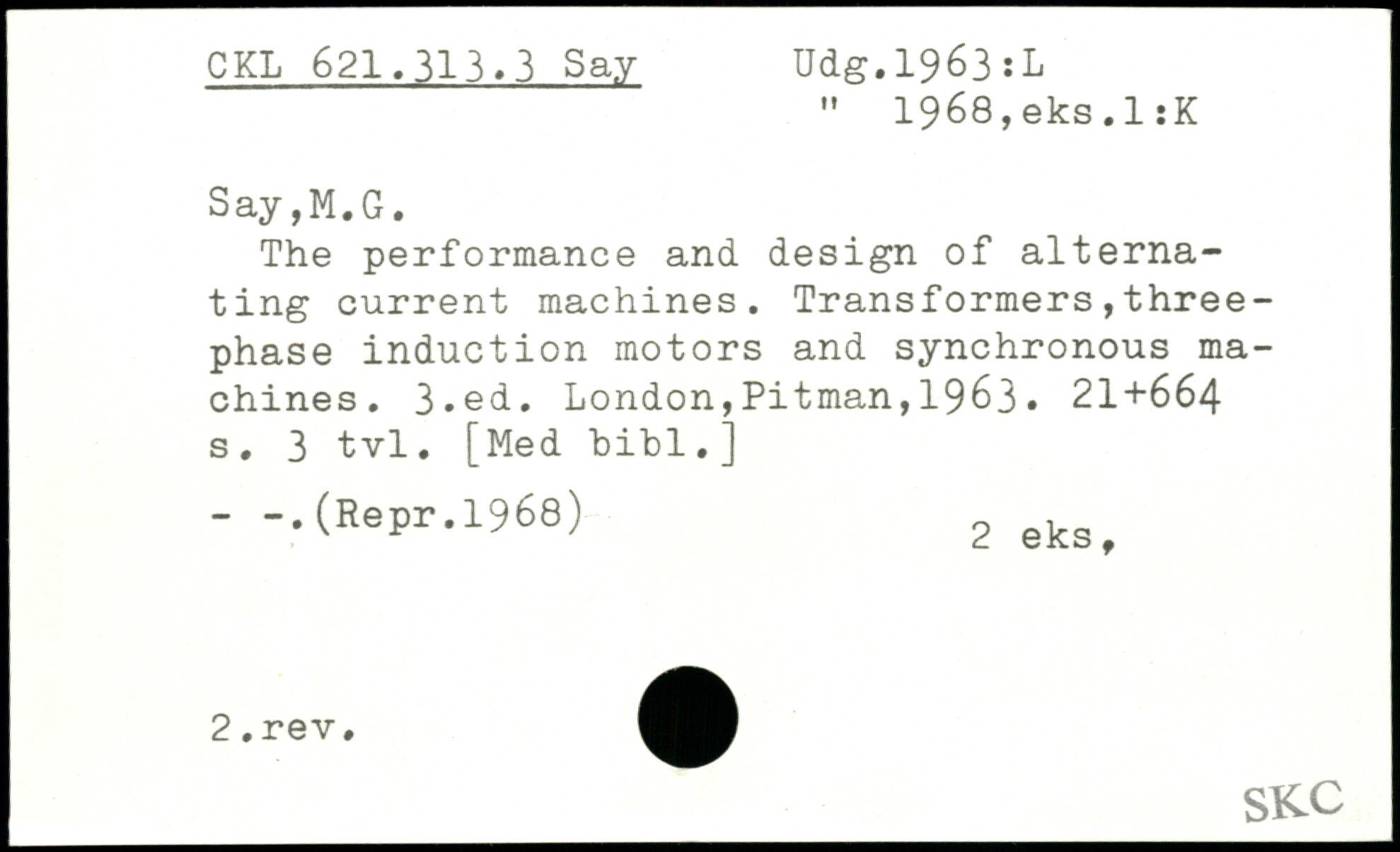 " 1968,eks.1:K Say,M.G. The performance and design of alternating current machines. Transformers,three-phase induction motors and synchronous machines.