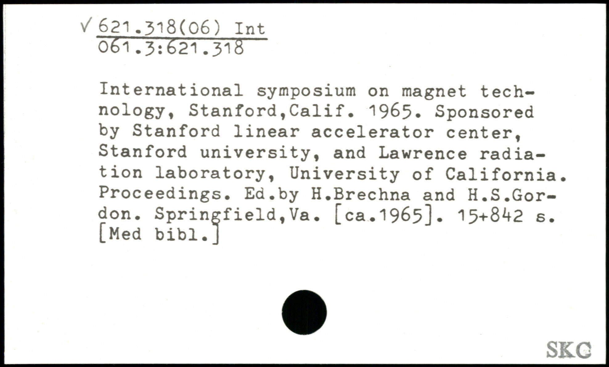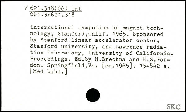 International symposium on magnet technology, Stanford,Calif. 1965. Sponsored by Stanford linear accelerator center, Stanford university, and Lawrence radiation laboratory, University of California. Proceedings. Ed.by H.Brechna and H.S.Gordon. Springfield,Va. [ca.1965]. 15+8^