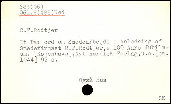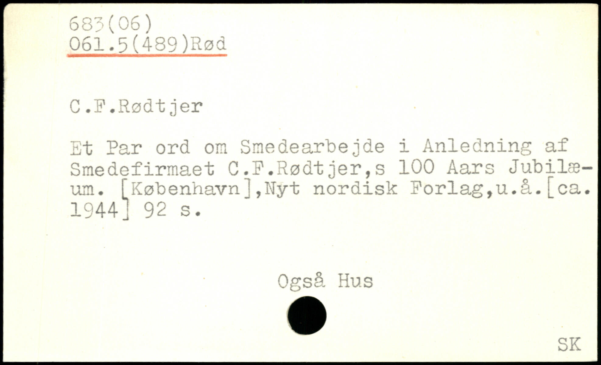 C.F.Rødt jer Et Par ord om Smedearbejde i Anledning af Smedefirmaet G.F.Rødt jer,s 100 Aars Jubilæum. [København],Nyt nordisk Forlag,u.å.[ca. 1944]