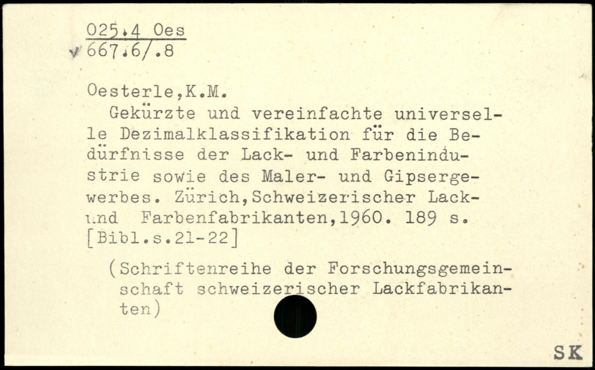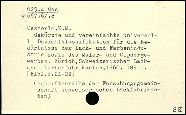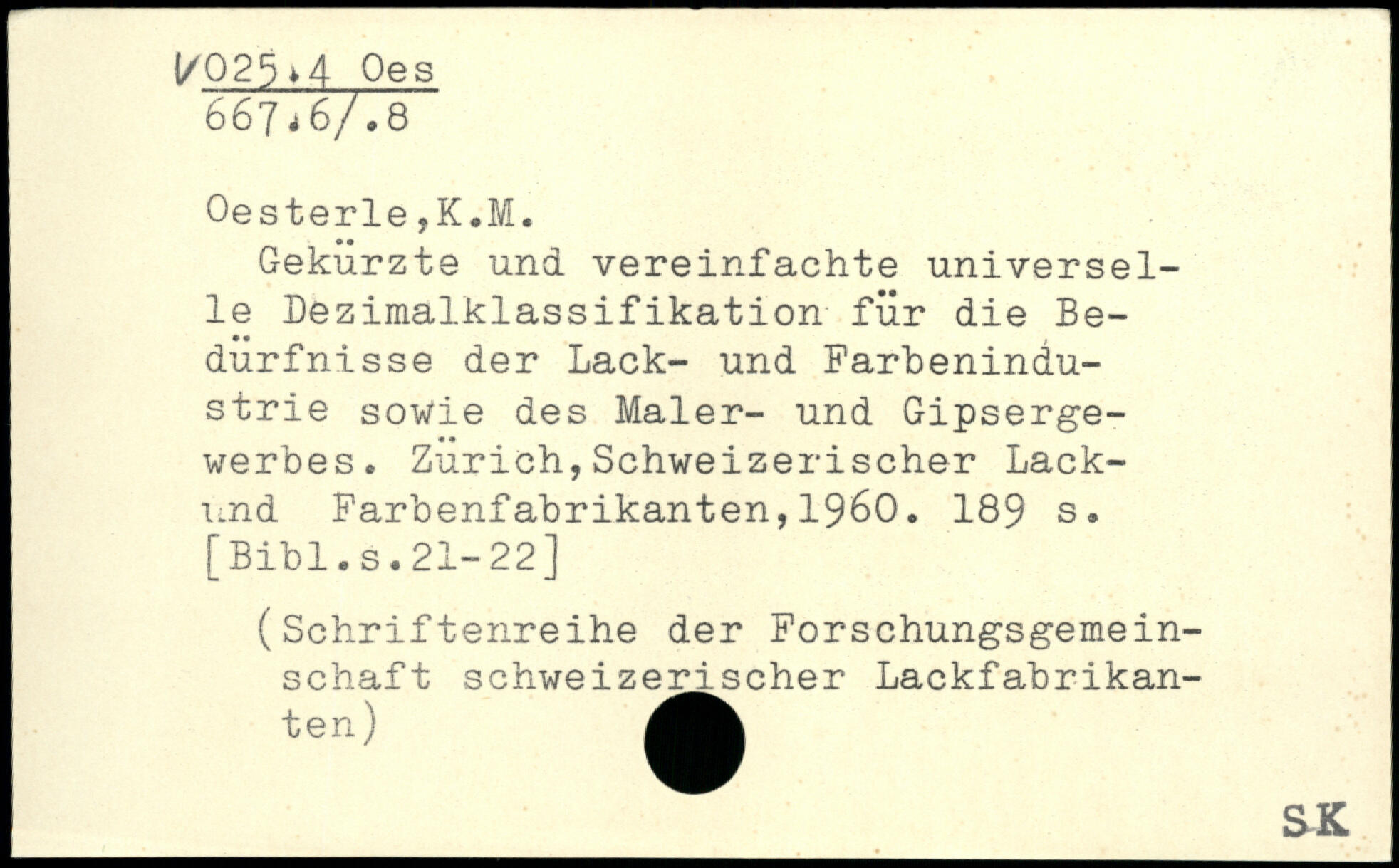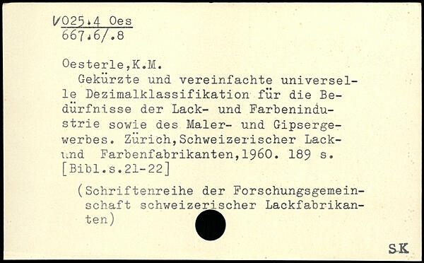 Gekürzte und vereinfachte universelle Dezimalklassifikation für die Bedürfnisse der Lack- und Farbenindustrie sowie des Maler- und Gipsergewerbes.