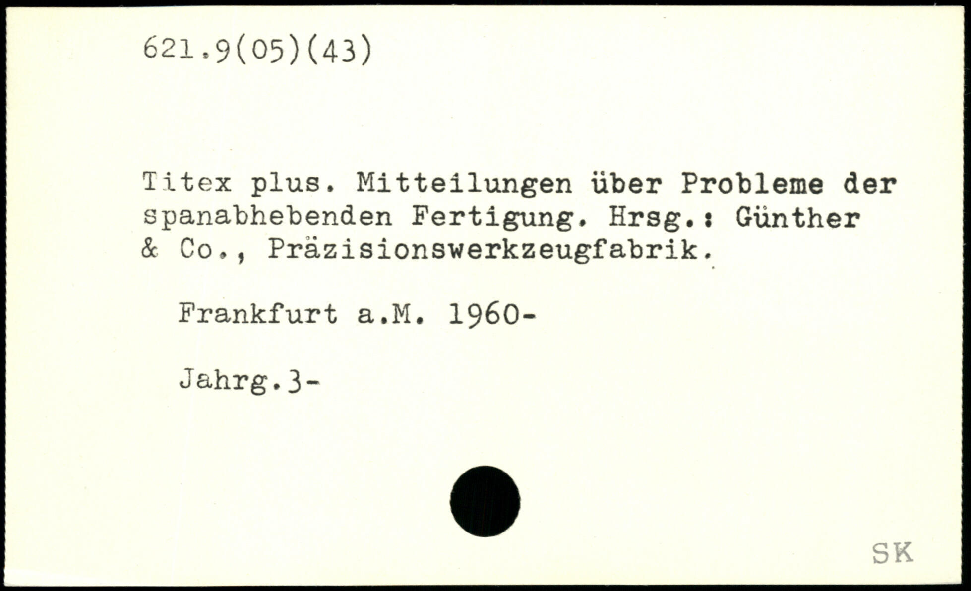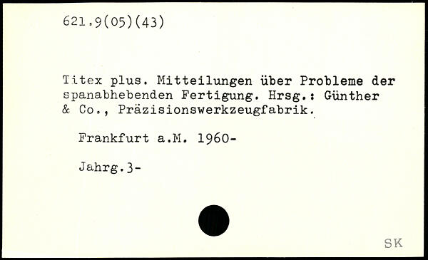 Titex plus, Mitteilungen über Probleme der spanabhebenden Fertigung. Hrsg,: Günther & Co., Präzisionswerkzeugfabrik. Frankfurt a.M. 1960- Jahrg.3-