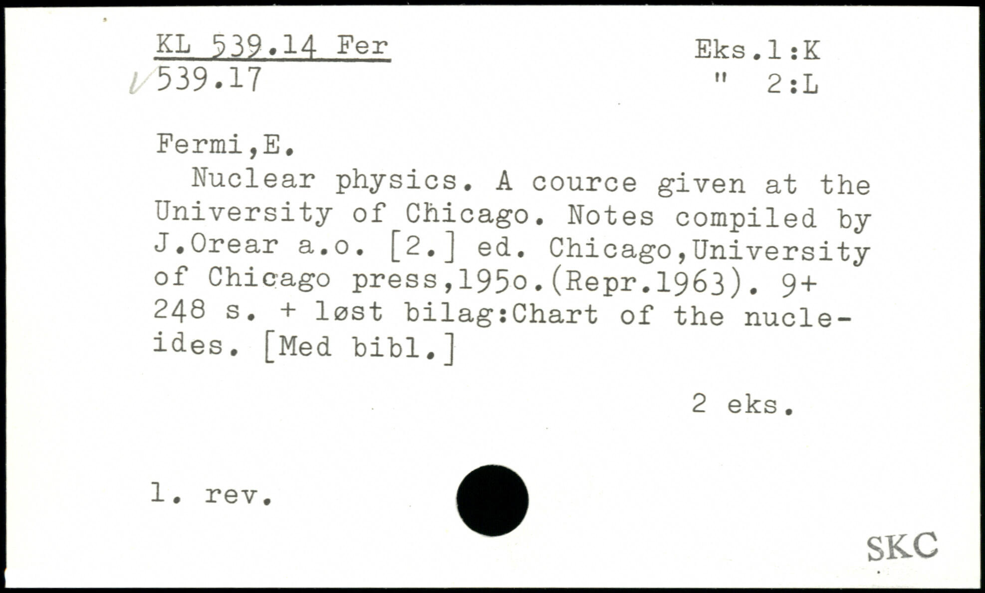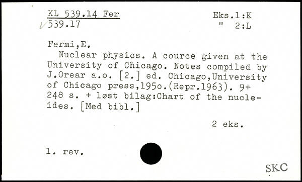 Nuclear physics. A cource given at the University of Chicago. Notes compiled by J.Orear a.o. [2.] ed. Chicago,University of Chicago press,195o.(Repr.1963). 9 +