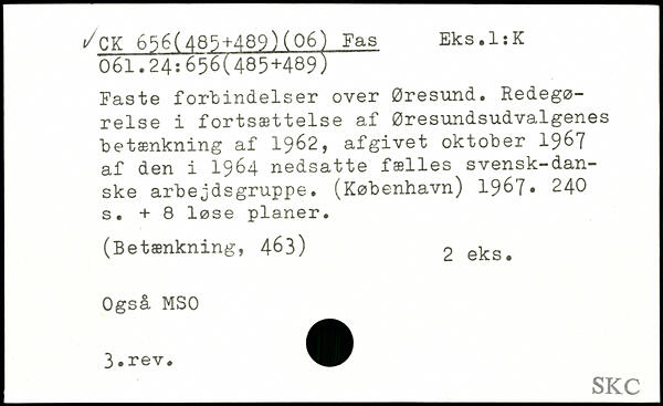 Faste forbindelser over Øresund. Redegørelse i fortsættelse af Øresundsudvalgenes betænkning af 1962, afgivet oktober 19^7 af den i 1964 nedsatte fælles svensk-danske arbejdsgruppe. (København) 19&7.