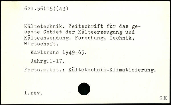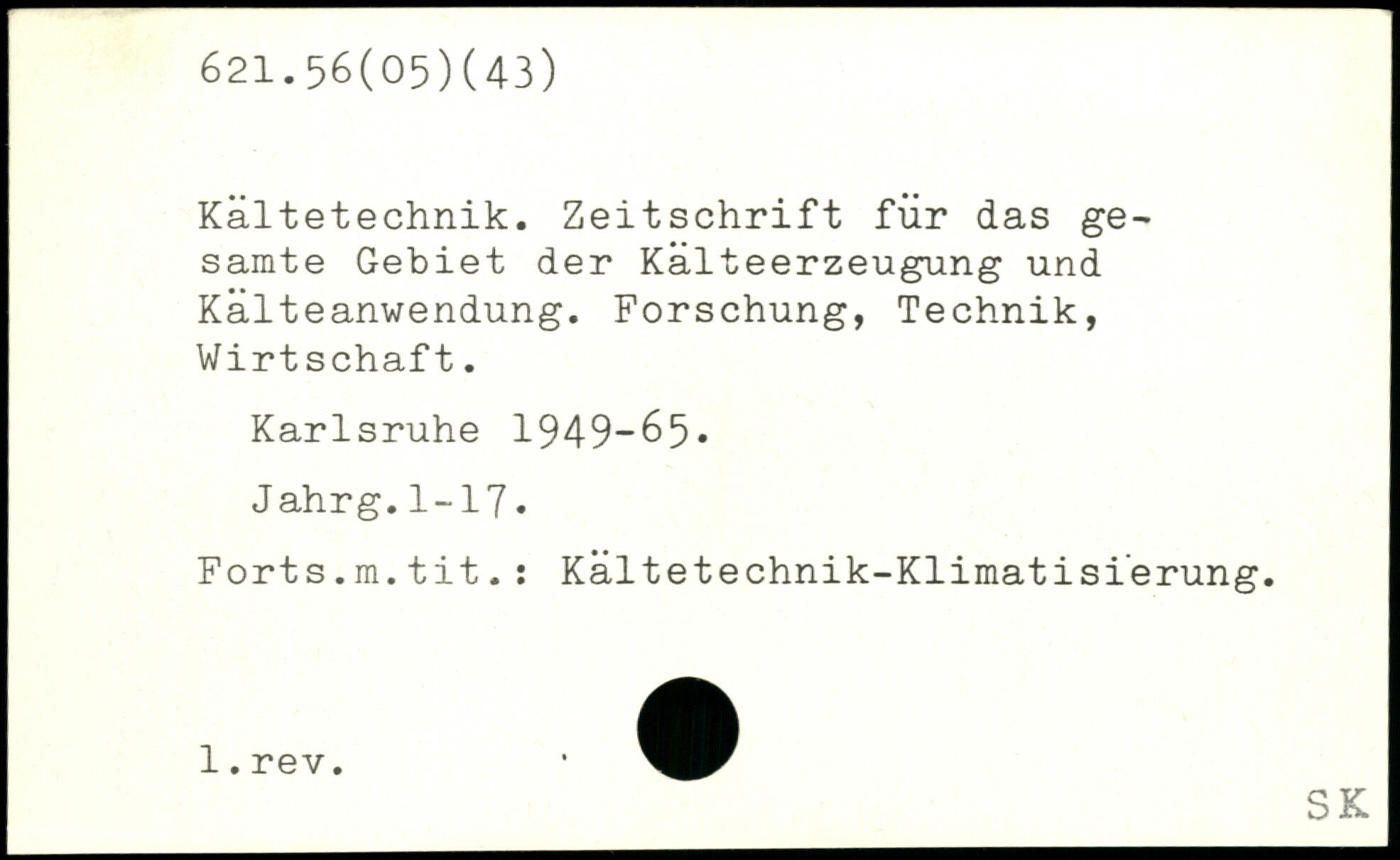 Kältetechnik. Zeitschrift für das ge-samte Gebiet der Kalteerzeugung und Kälteanwendung. Forschung, Technik, Wirtschaft. Karlsruhe 1949-65. Jahrg.1-17, Forts. in. tit. : Kältetechnik-Klimatisierung.