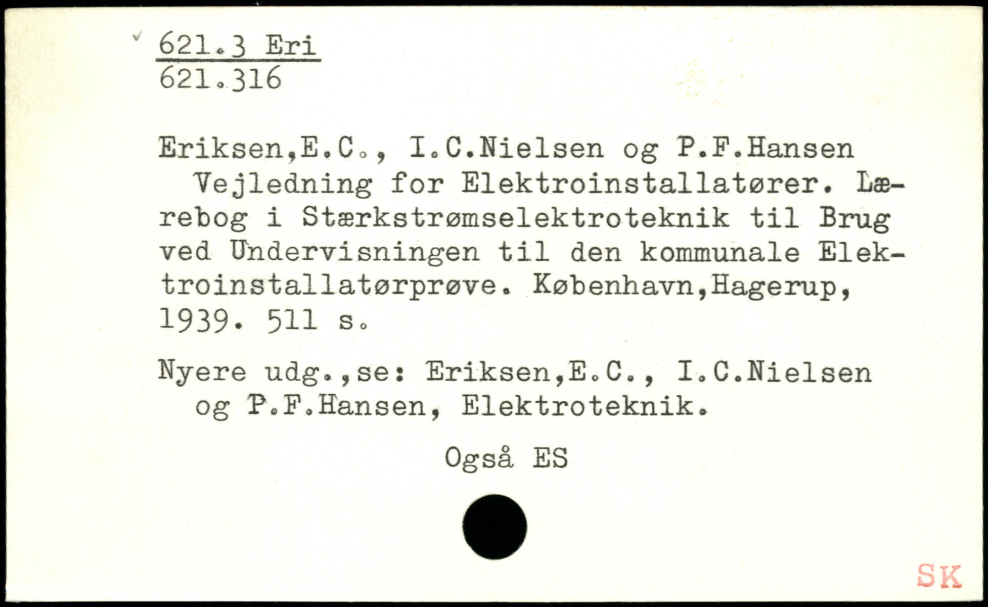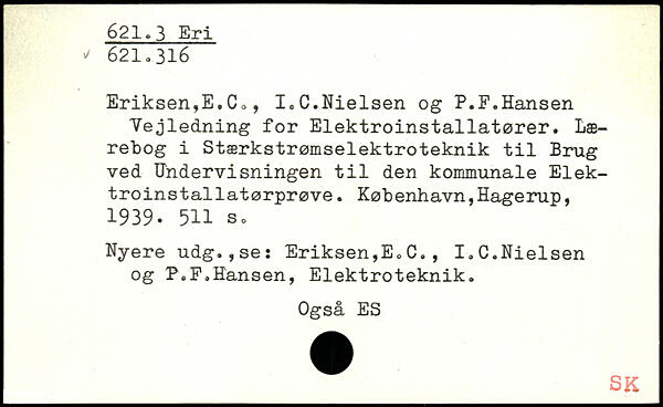 Eriksen,E.C., I,C.Nielsen og P.P.Hansen Vejledning for Elektroinstallatører. Lærebog i Stærkstrømselektroteknik til Brug ved Undervisningen til den kommunale Elek-troinstallatørprøve.