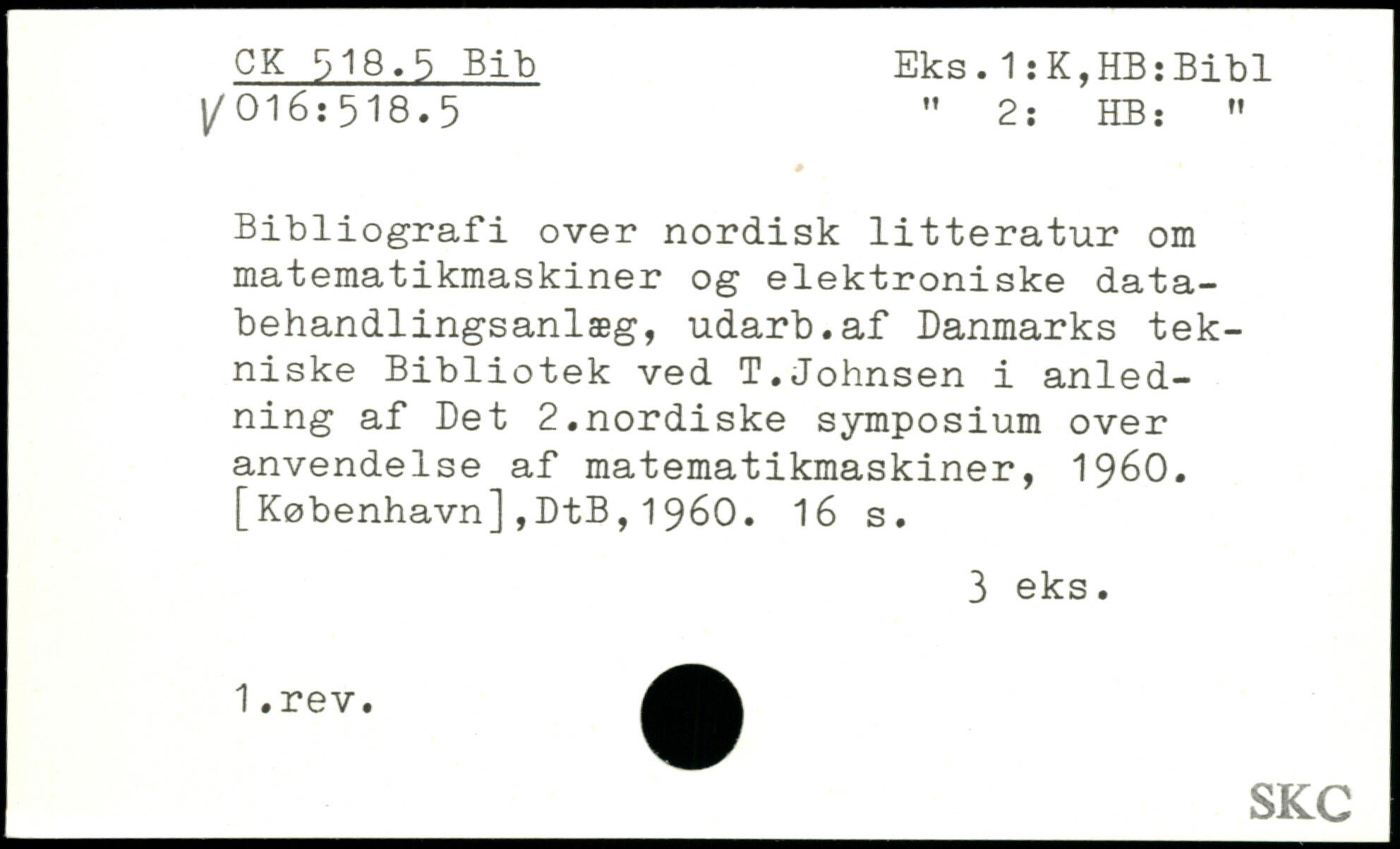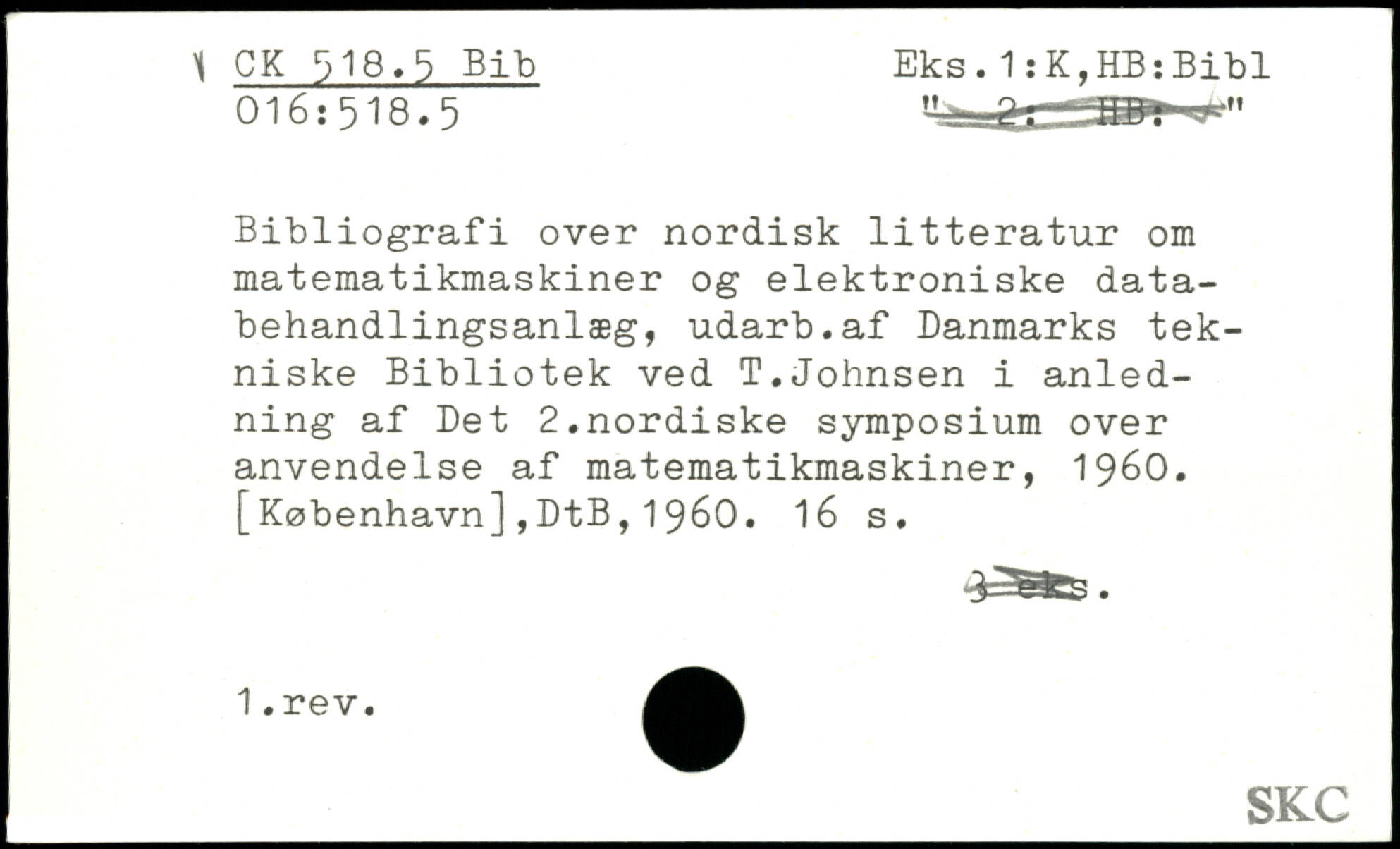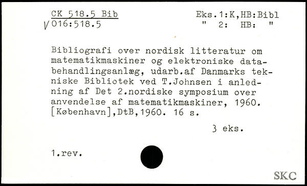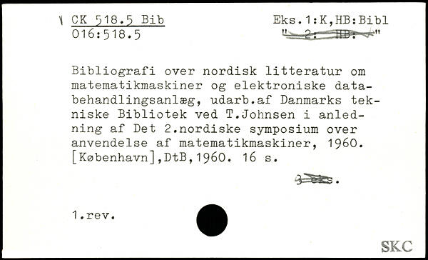 Bibliografi over nordisk litteratur om matematikmaskiner og elektroniske databehandlingsanlæg, udarb.af Danmarks tekniske Bibliotek ved T.Johnsen i anledning af Det 2.nordiske symposium over anvendelse af matematikmaskiner, 1960.