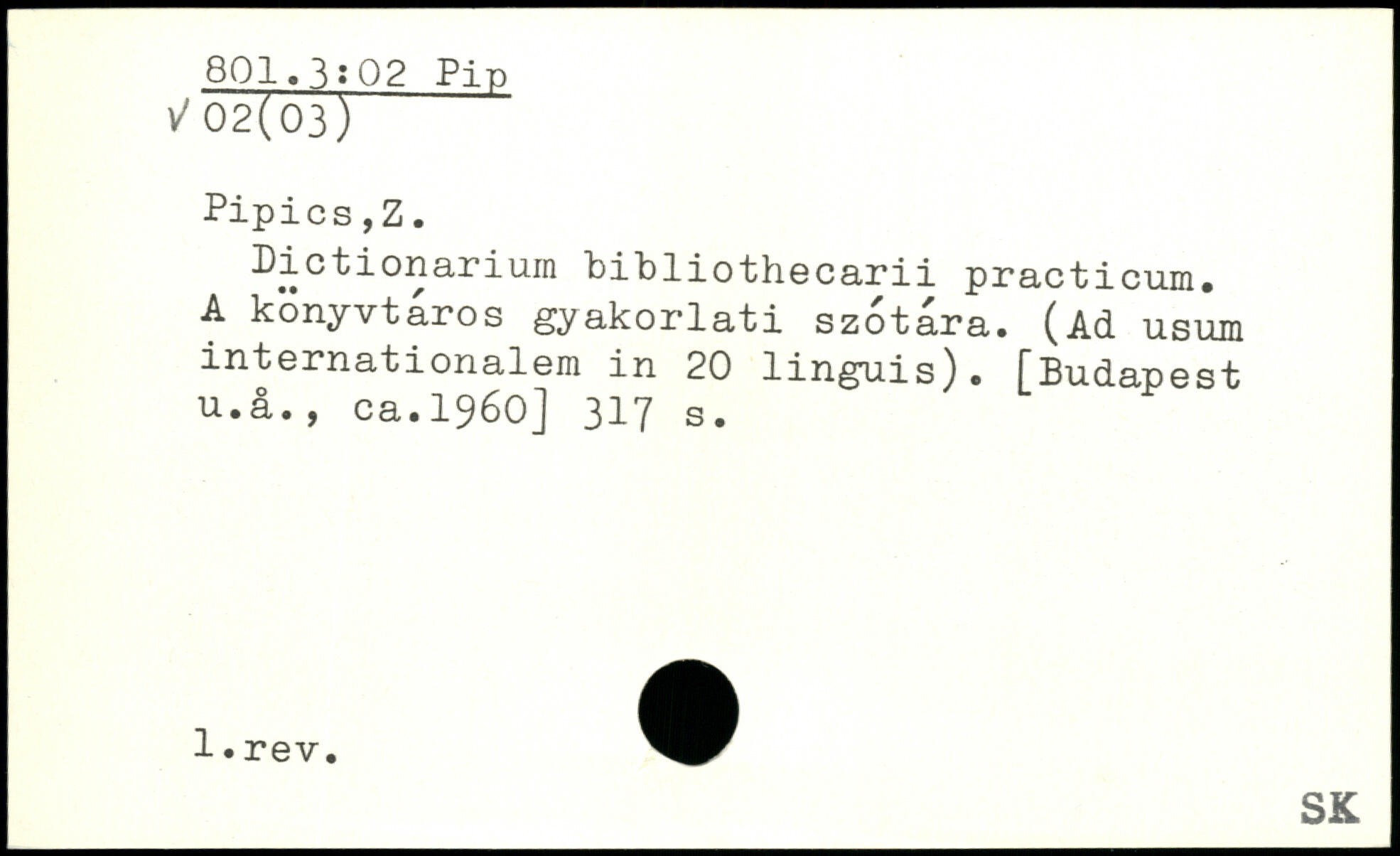 Dictionarium bibliothecarii practicum. A konyvtâros gyakorlati szotara. (Ad usum internationalem in 20 linguis). [Budapest u.å., ca.1960]
