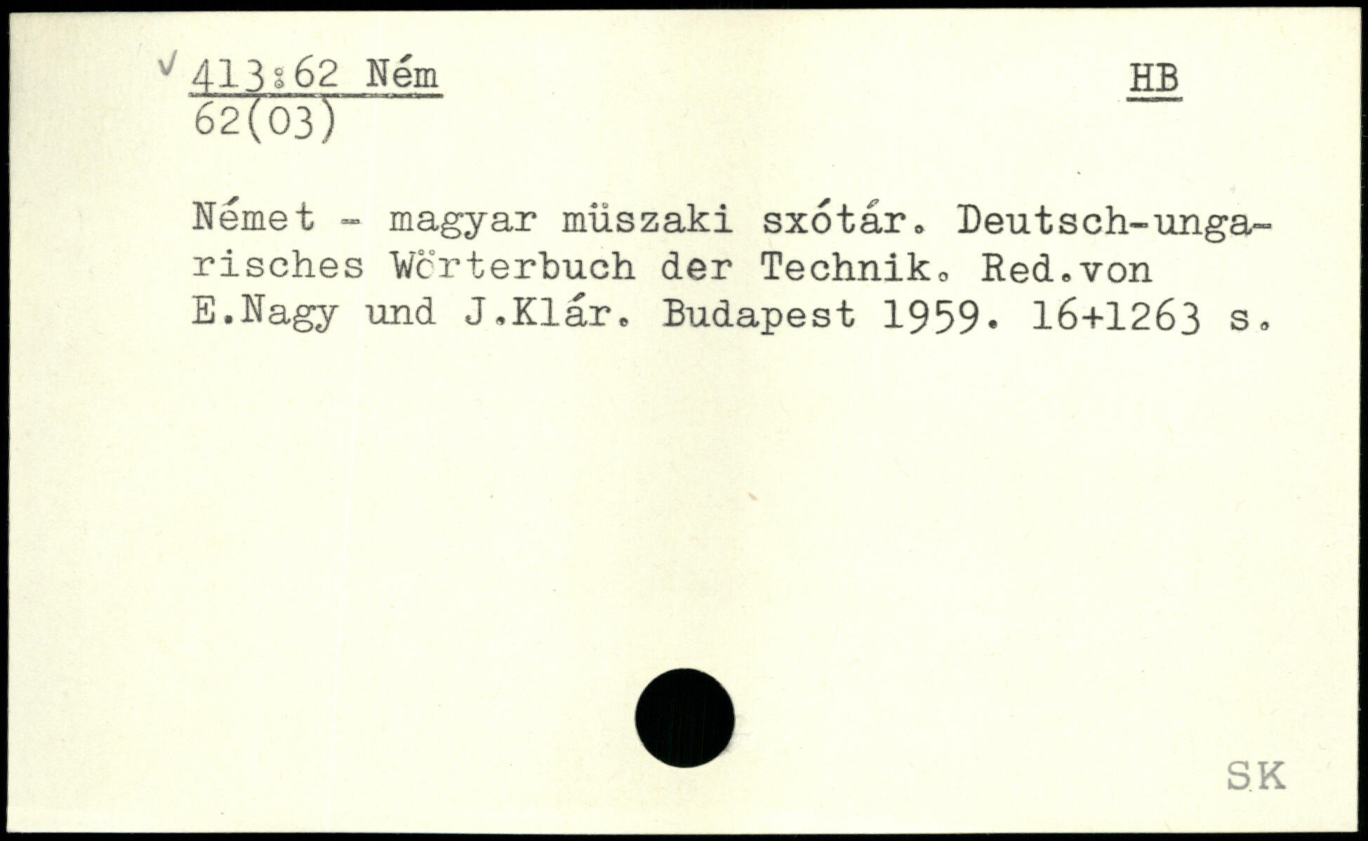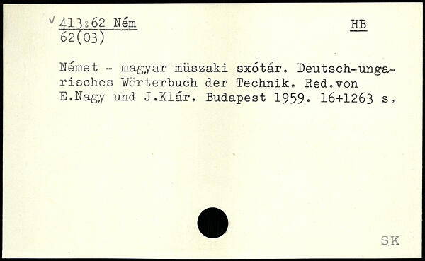 Nemet - magyar müszaki sxotar. Beutsch-ungarisches Wörterbuch der Technik, Red.von E.Nagy und J.Klar.