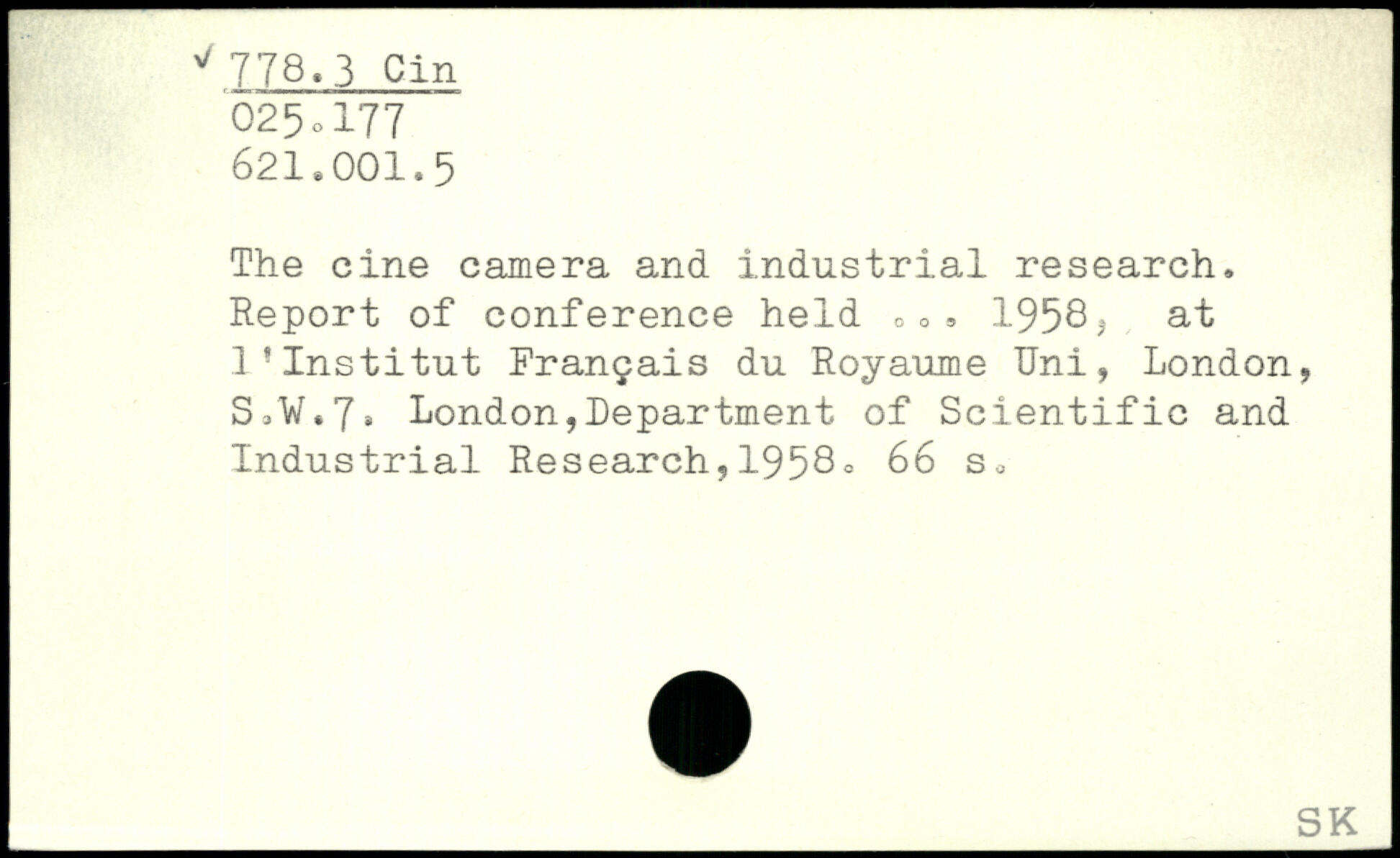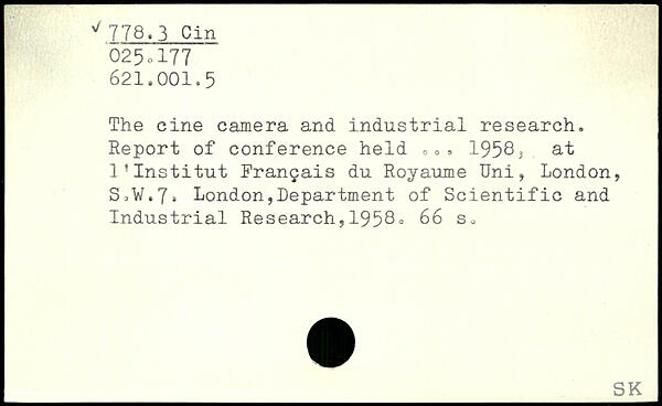 The cine camera and industrial research. Report of conference held <><=, 1958, , at l’Institut Français du Royaume Uni, London, S.W.7. London,Department of Scientific and Industrial Research,1958.