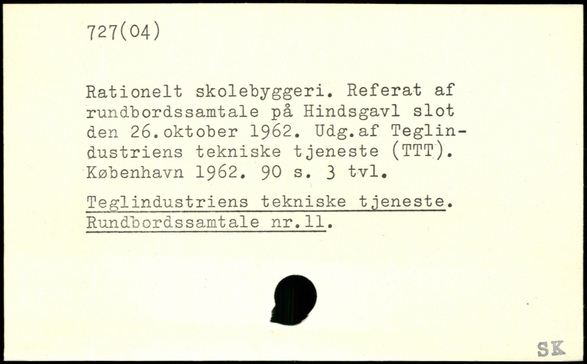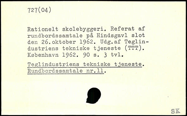 Rationelt skolebyggeri. Referat af rundbordssamtale på Hindsgavl slot den 26.oktober 1962. Udg.af Teglindustriens tekniske tjeneste (TTT).