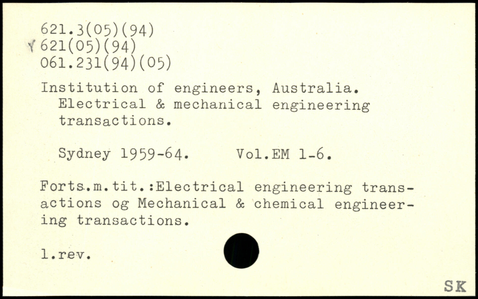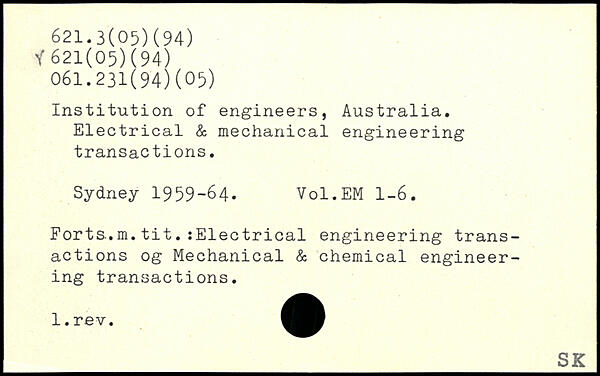 Institution of engineers, Australia. Electrical & mechanical engineering transactions. Sydney 1959-64, Vol.EM 1-6. Forts.m.tit.sElectrical engineering transactions og Mechanical & chemical engineering transactions.