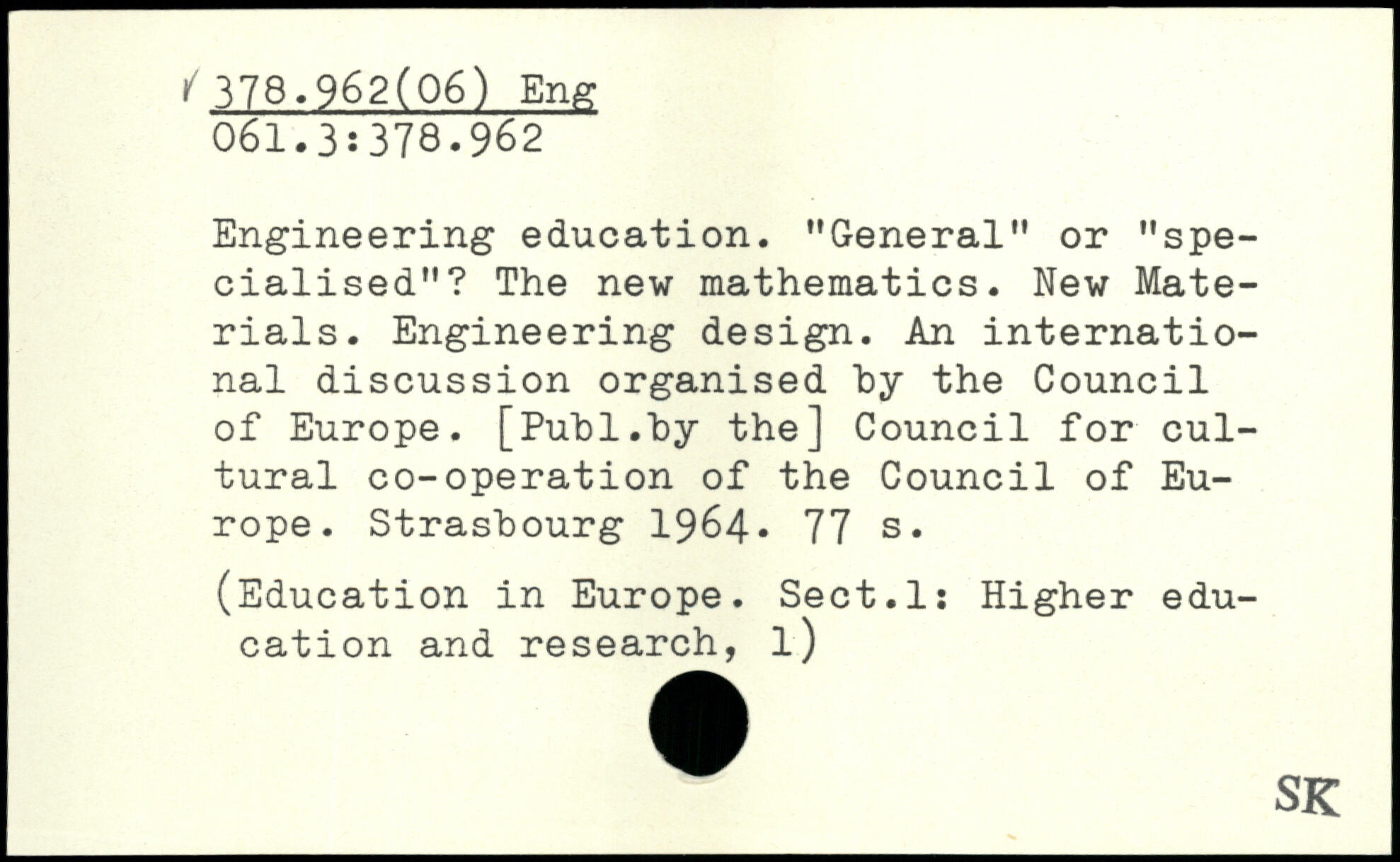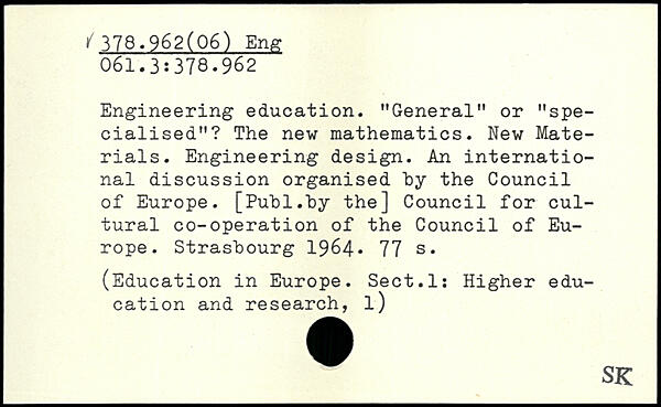 Engineering education. "General" or "specialised"? The new mathematics. New Materials. Engineering design. An international discussion organised by the Council of Europe.