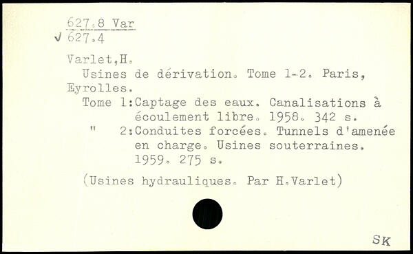 Varlet,He Usines de dérivation, Tome 1-2, Paris, Eyrolles. Tome 1:Captage des eaux. Canalisations à écoulement libre, 1958