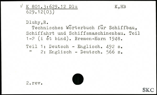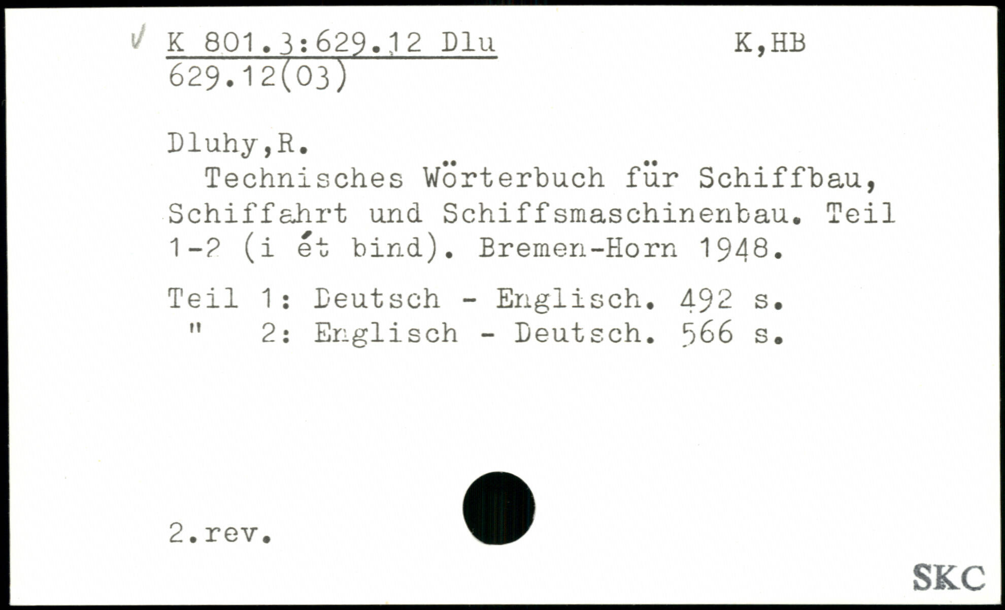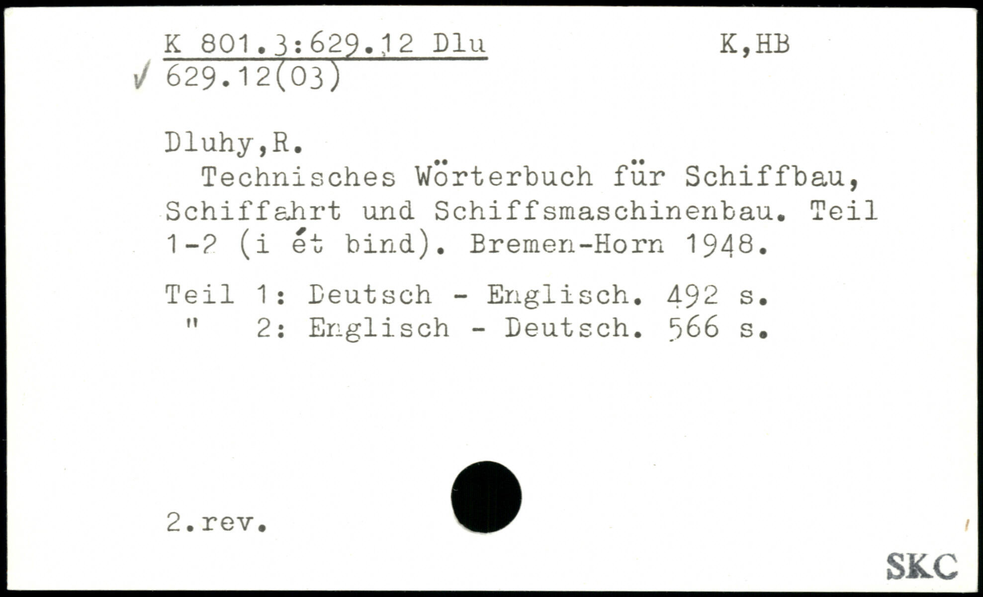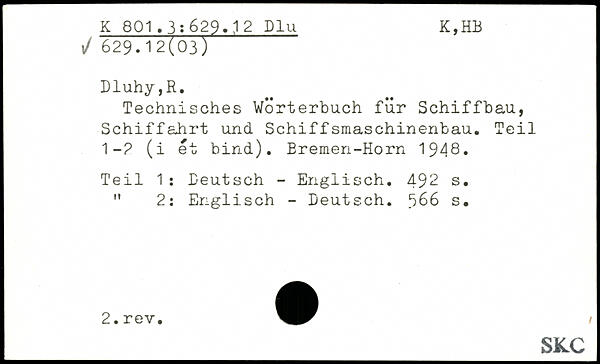 Technisches Wörterbuch für Schiffbau, Schiffahrt und Schiffsmaschinenbau. Teil 1-2 (i et bind). Bremen-Horn 1948, Teil 1 : Deutsch - Englisch.