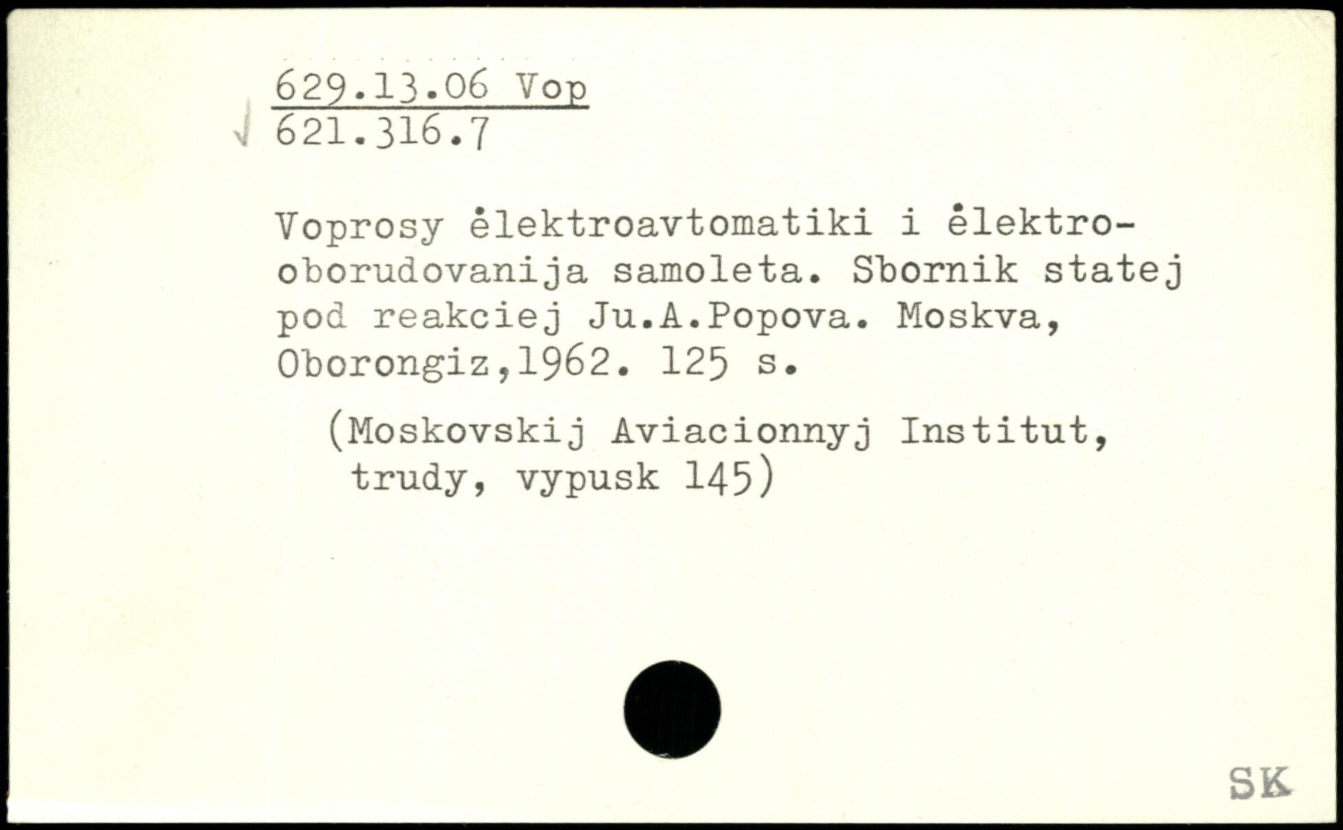Voprosy elektroavtomatiki i elektro-oborudovanija samoleta. Sbornik statej pod reakciej Ju.A.Popova.
