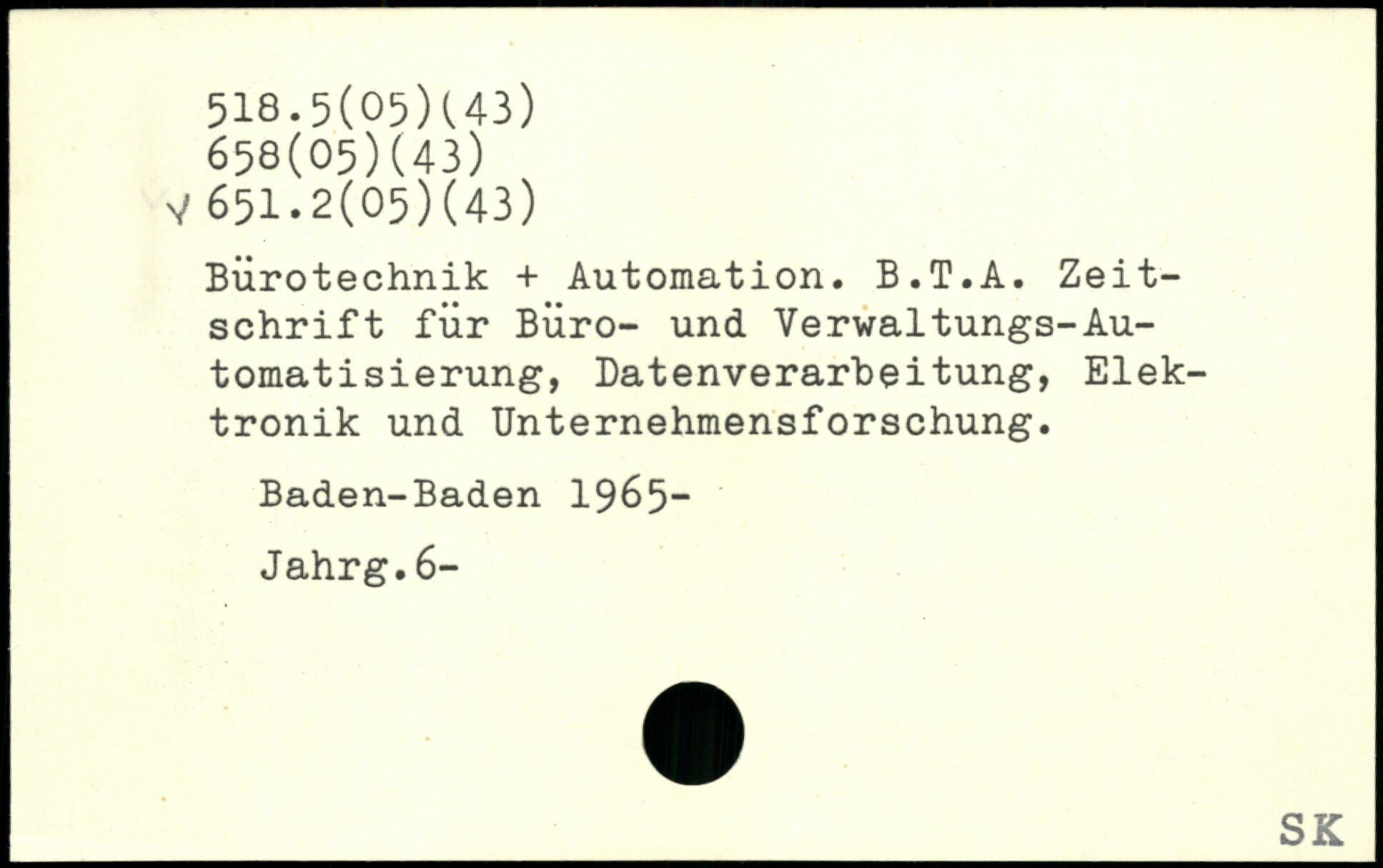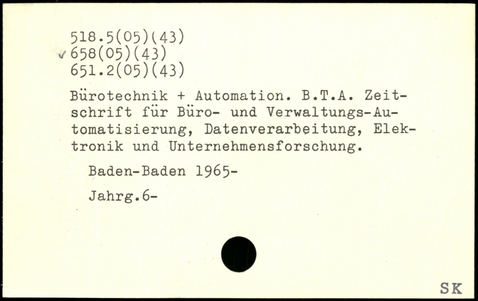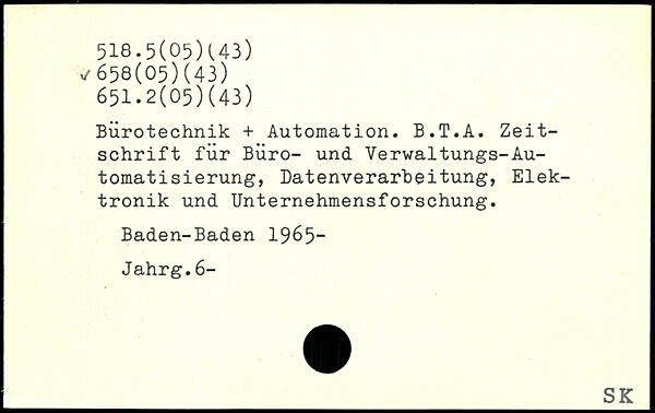 Bürotechnik + Automation. B.T.A. Zeitschrift für Büro- und Verwaltungs-Automatisierung, Datenverarbeitung, Elektronik und Unternehmensforschung. Baden-Baden 1965- Jahrg.6-