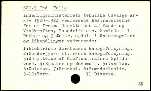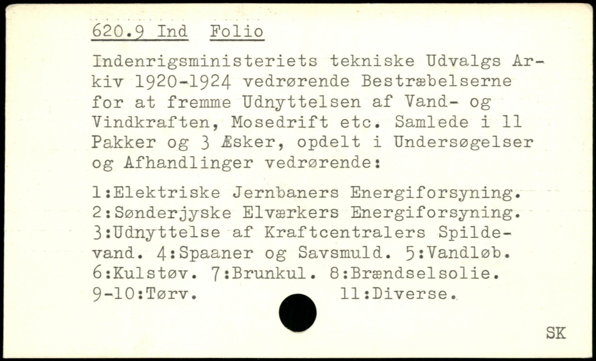 Indenrigsministeriets tekniske Udvalgs Arkiv 1920-1924 vedrørende Bestræbelserne for at fremme Udnyttelsen af Vand- og Vindkraften, Mosedrift etc. Samlede i 11 Pakker og 3 Æsker, opdelt i Undersøgelser og Afhandlinger vedrørende: l:Elektriske Jernbaners Energiforsyning. 2:Sønderjyske Elværkers Energiforsyning. 3:Udnyttelse af Kraftcentralers Spildevand. 4iSpaaner og Savsmuld. 5:Vandløb. 6:Kulstøv.