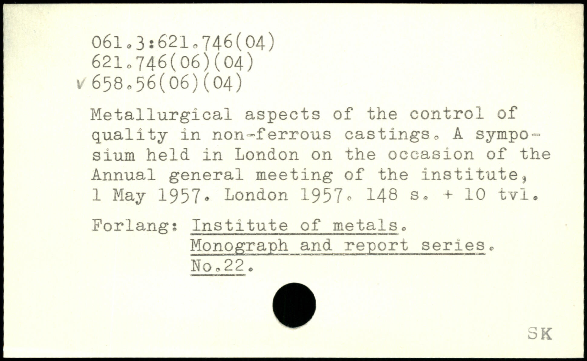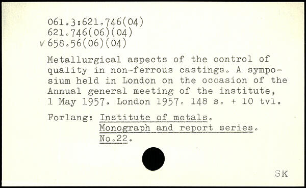Metallurgical aspects of the control of quality in non-ferrous castings, A sympo™ sium held in London on the occasion of the Annual general meeting of the institute, 1 May 1957.