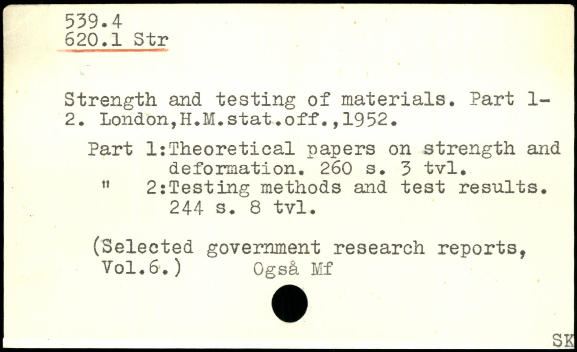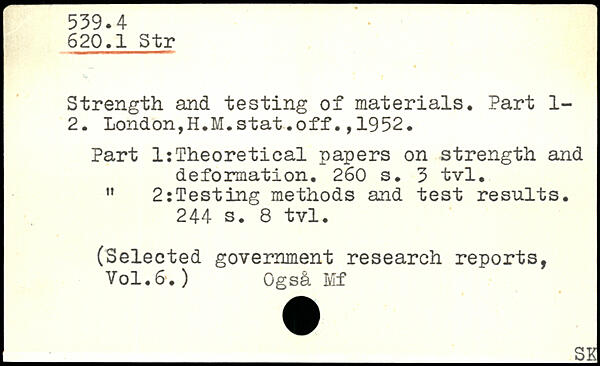 Strength and testing of materials. Part 1-2. London,H.M.stat.off.,1952. Part 1:Theoretical papers on strength and deformation.