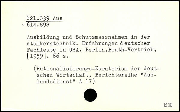 Ausbildung und Schutzmassnahmen in der Atomkerntechniko Erfahrungen deutscher Fachleute in TJSA,. Berlin,Beuth-Vertrieb, r1959].