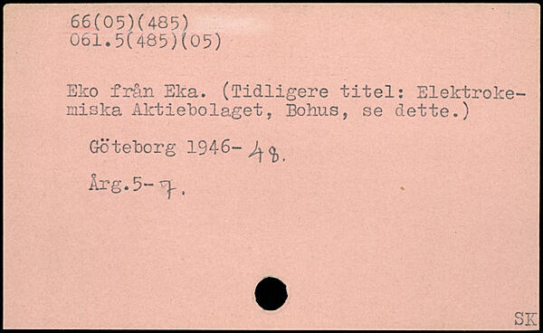 Eko från Eka. (Tidligere titel: Elektroke-miska Aktiebolaget, Bohus, se dette.) Goteborg 1946- 4%.