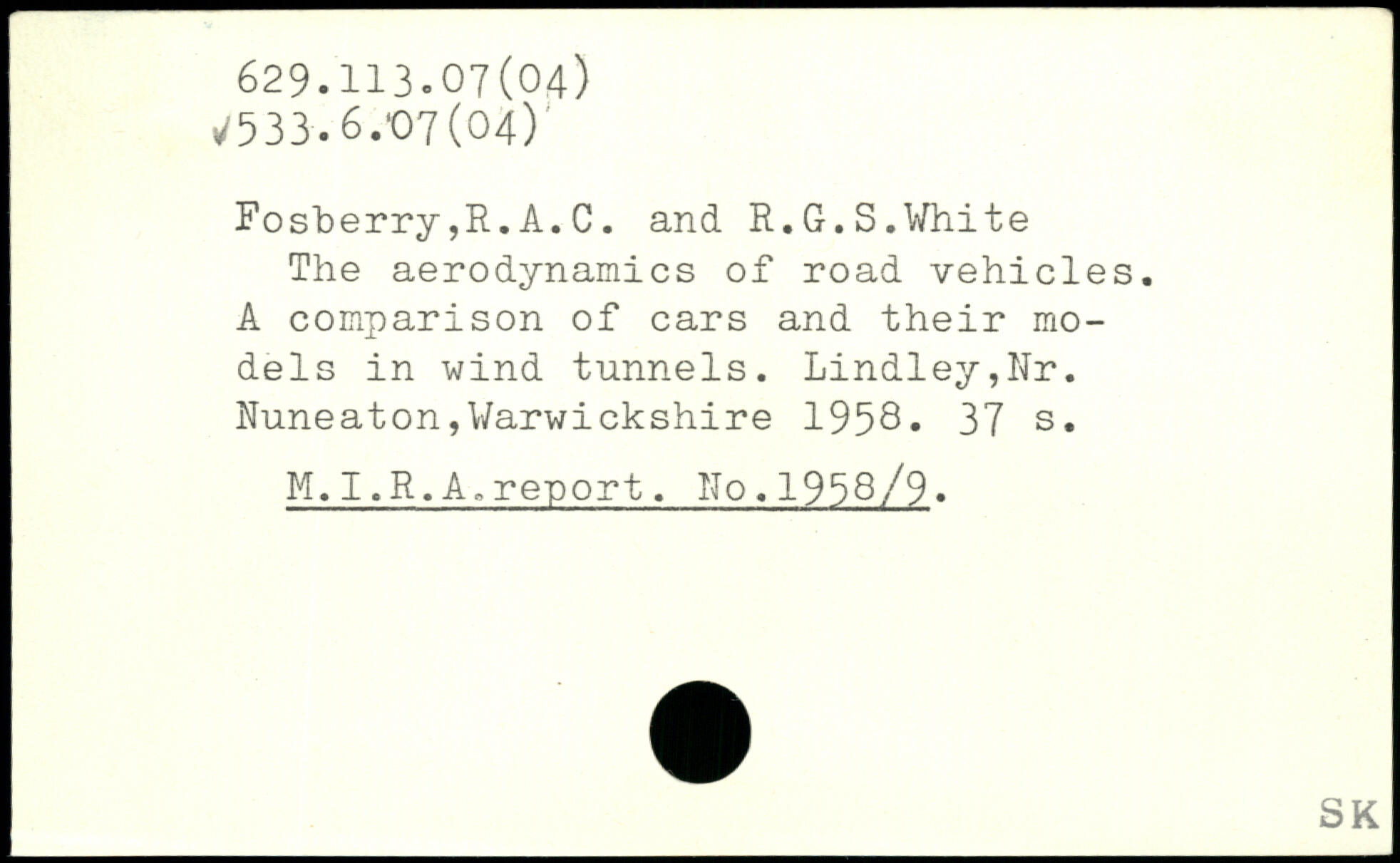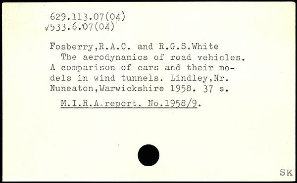 The aerodynamics of road vehicles. A comparison of cars and their models in wind tunnels. Lindley,Nr. Nuneaton,Warwickshire 1958-