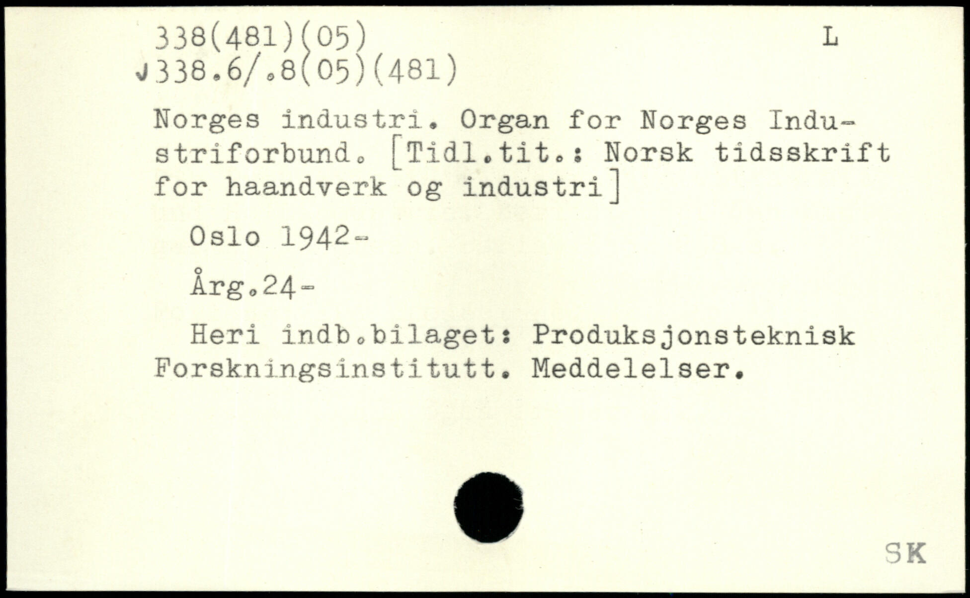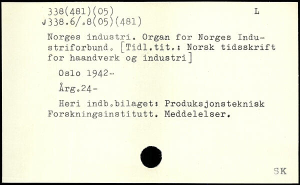 Norges industri. Organ for Norges Industrif orbund 0 [Tidl.titoi Norsk tidsskrift for haandverk og industri] Oslo 1942- lrg024~ Heri indbobilaget: Produksjonsteknisk Forskningsinstitutt. Meddelelser.