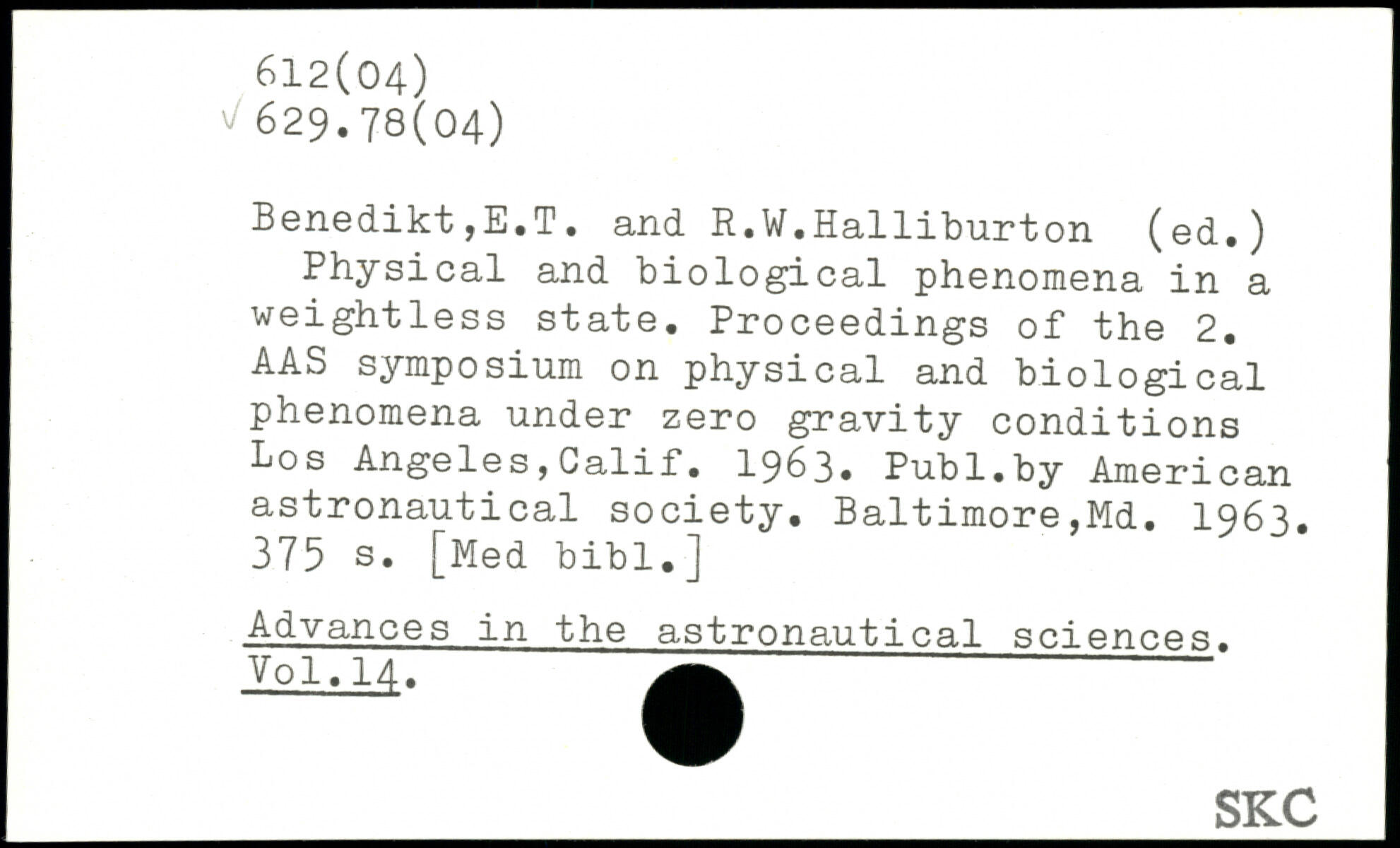 Physical and biological phenomena in a weightless state. Proceedings of the 2. AAS symposium on physical and biological phenomena under zero gravity conditions Los Angeles,Calif. 1963.