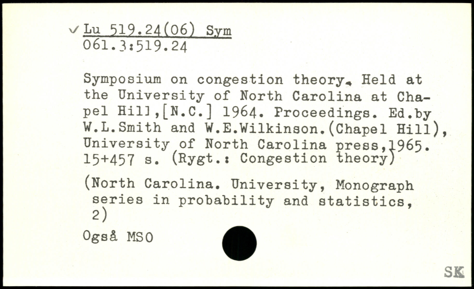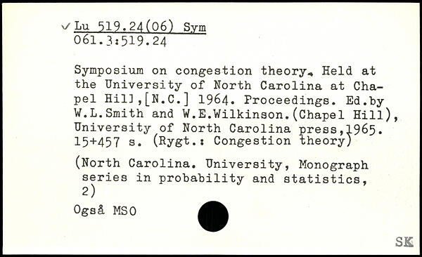 Symposium on congestion theory. Held at the University of North Carolina at Chapel Hil],[N.C.] 1964. Proceedings. Ed.by W.L.Smith and W.E.Wilkinson.(Chapel Hill), University of North Carolina press,1965.