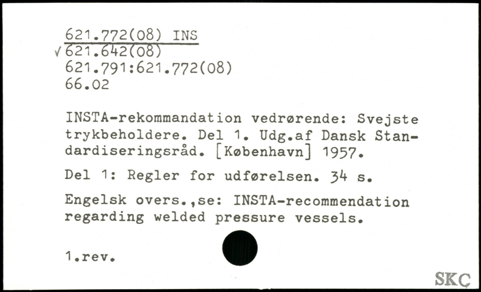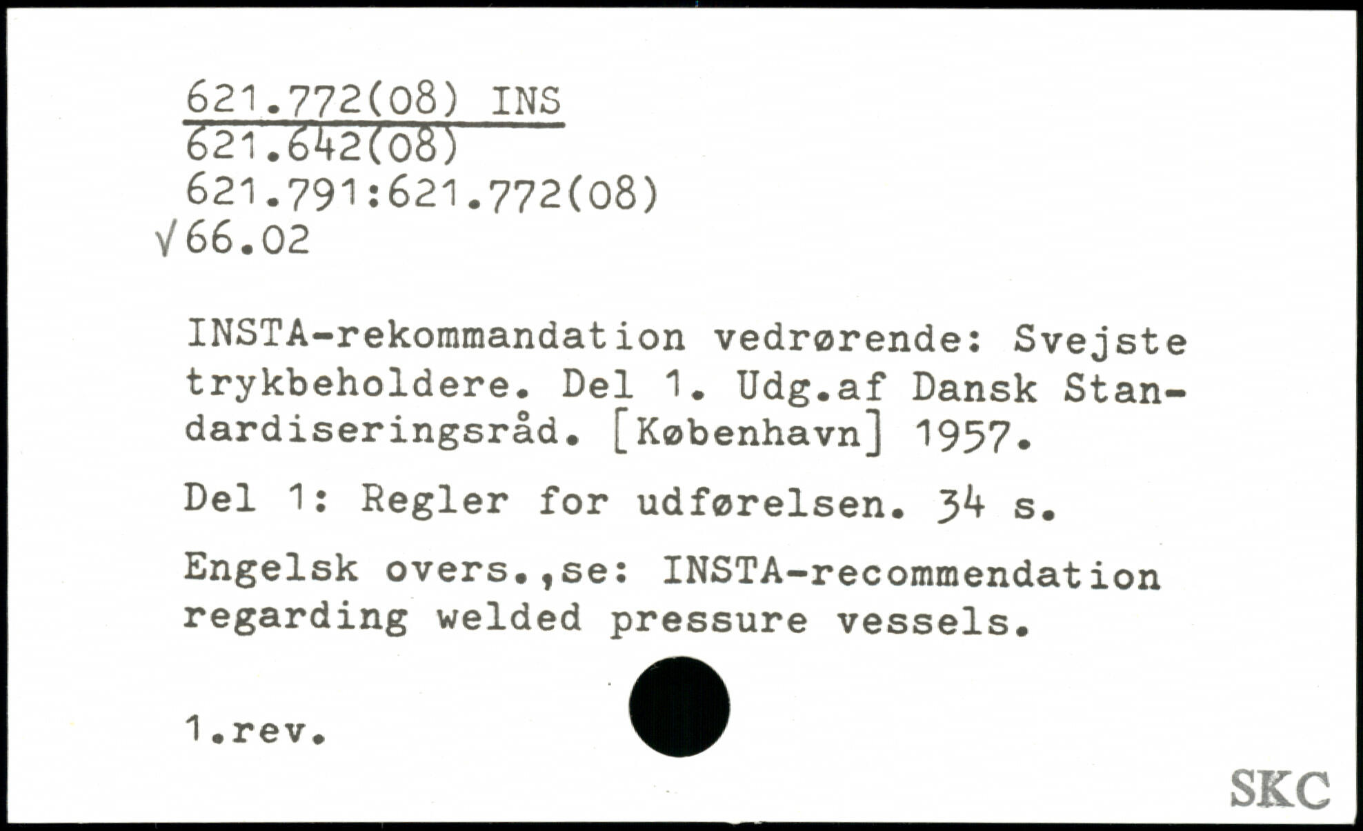 INSTA-rekommandation vedrørende: Svejste trykbeholdere. Del 1. Udg.af Dansk Standardiseringsråd.