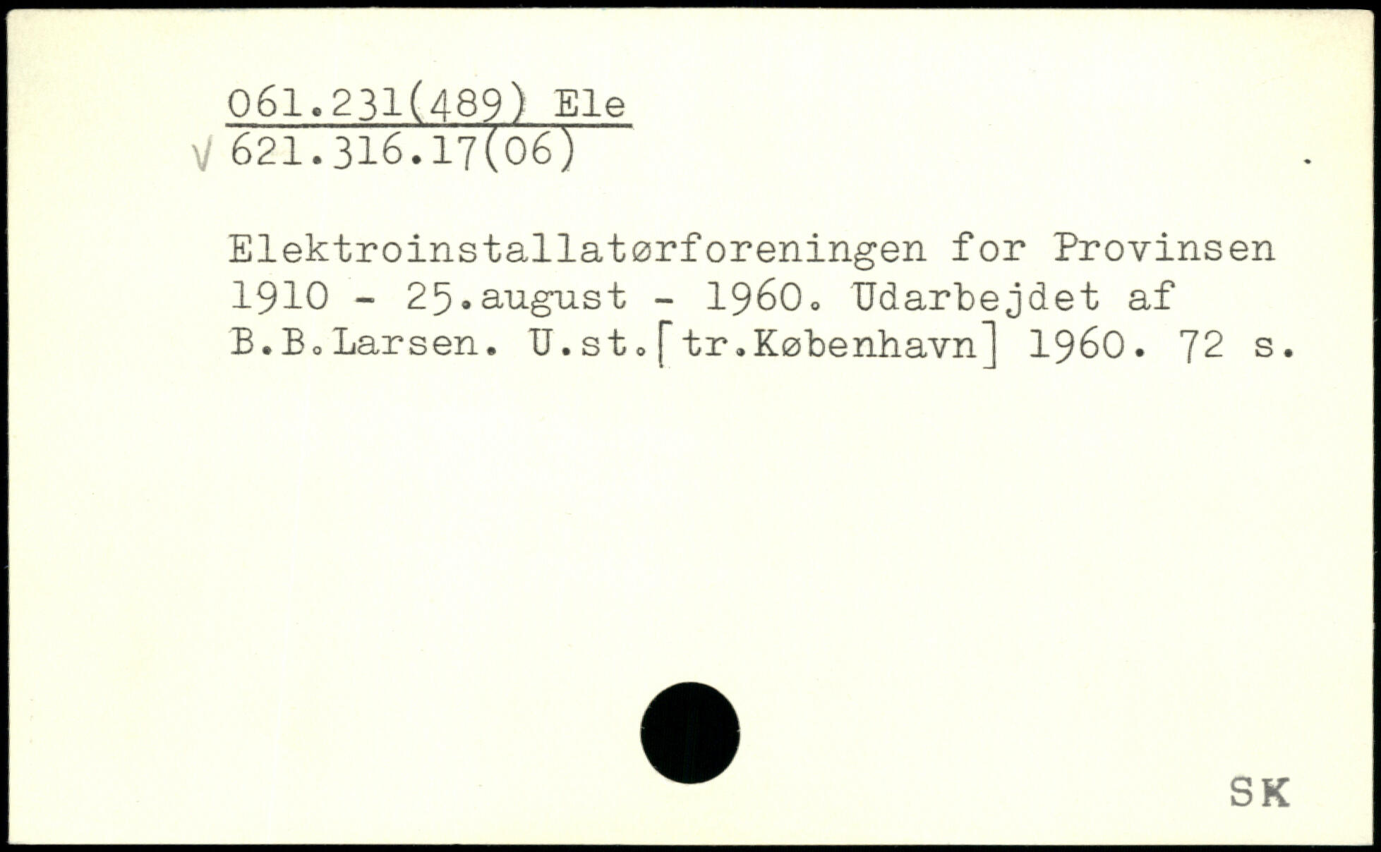 Elektroinstallatørforeningen for Provinsen 1910 - 25.august - 19600 Udarbejdet af B.Bo Larsen. U.st.[tr.