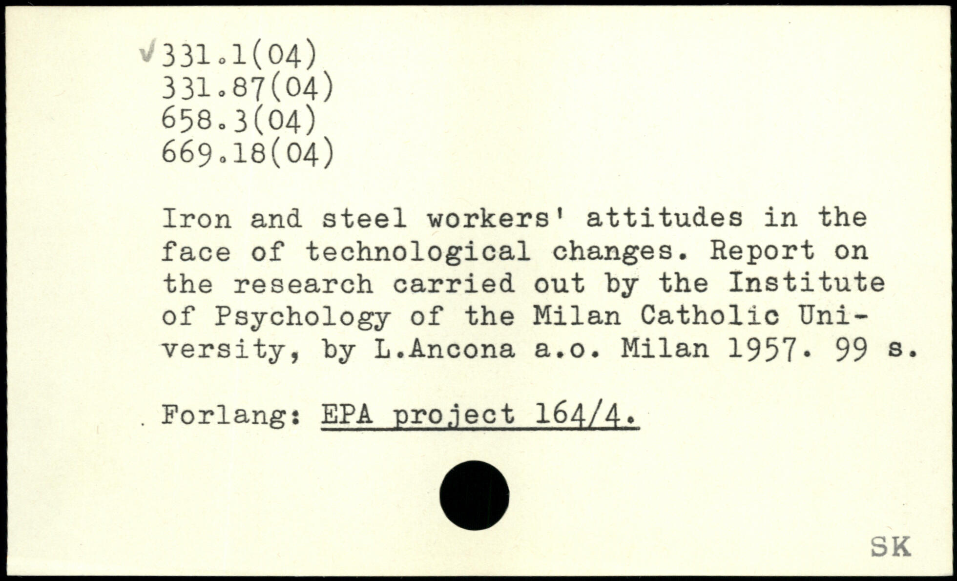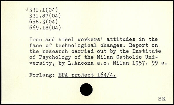 Iron and steel workers' attitudes in the face of technological changes. Report on the research carried out by the Institute of Psychology of the Milan Catholic University, by L.Ancona a.o.