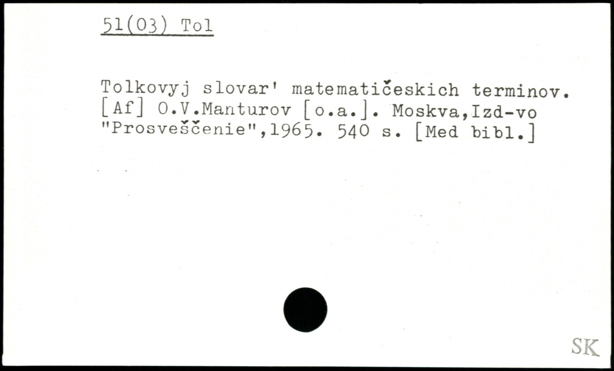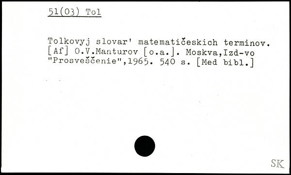 Tolkovyj s lovar' matematiceskich terminov. [Af] O.V.Manturov [o.a.J. Moskva,Izd-vo "Prosvescenie",1963. 54O s. [Med bibl.]