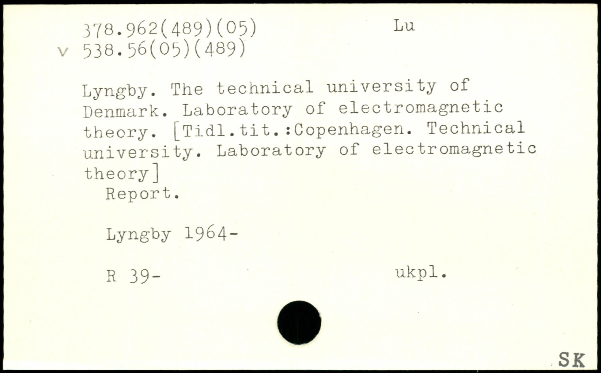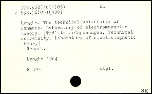 Lyngby. The technical university of Denmark. Laboratory of electromagnetic theory. [Tidl.tit.:Copenhagen. Technical university. Laboratory of electromagnetic theory] Report. Lyngby 1964- R 39- ukpl.