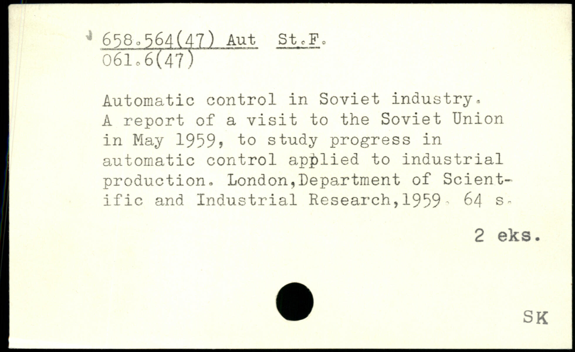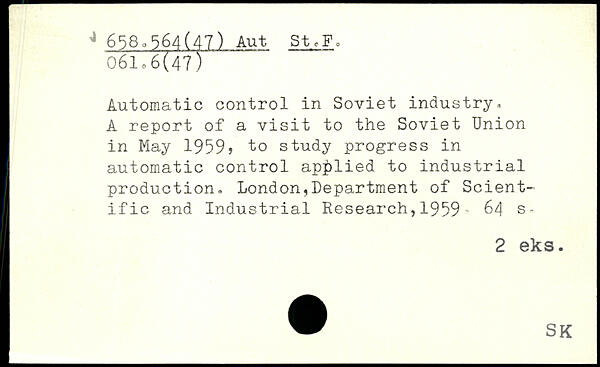 Automatic control in Soviet industry, A report of a visit to the Soviet Union in May 1959, to study progress in automatic control applied to industrial j production, London,Department of Scient- l ific and Industrial Research,1959 -