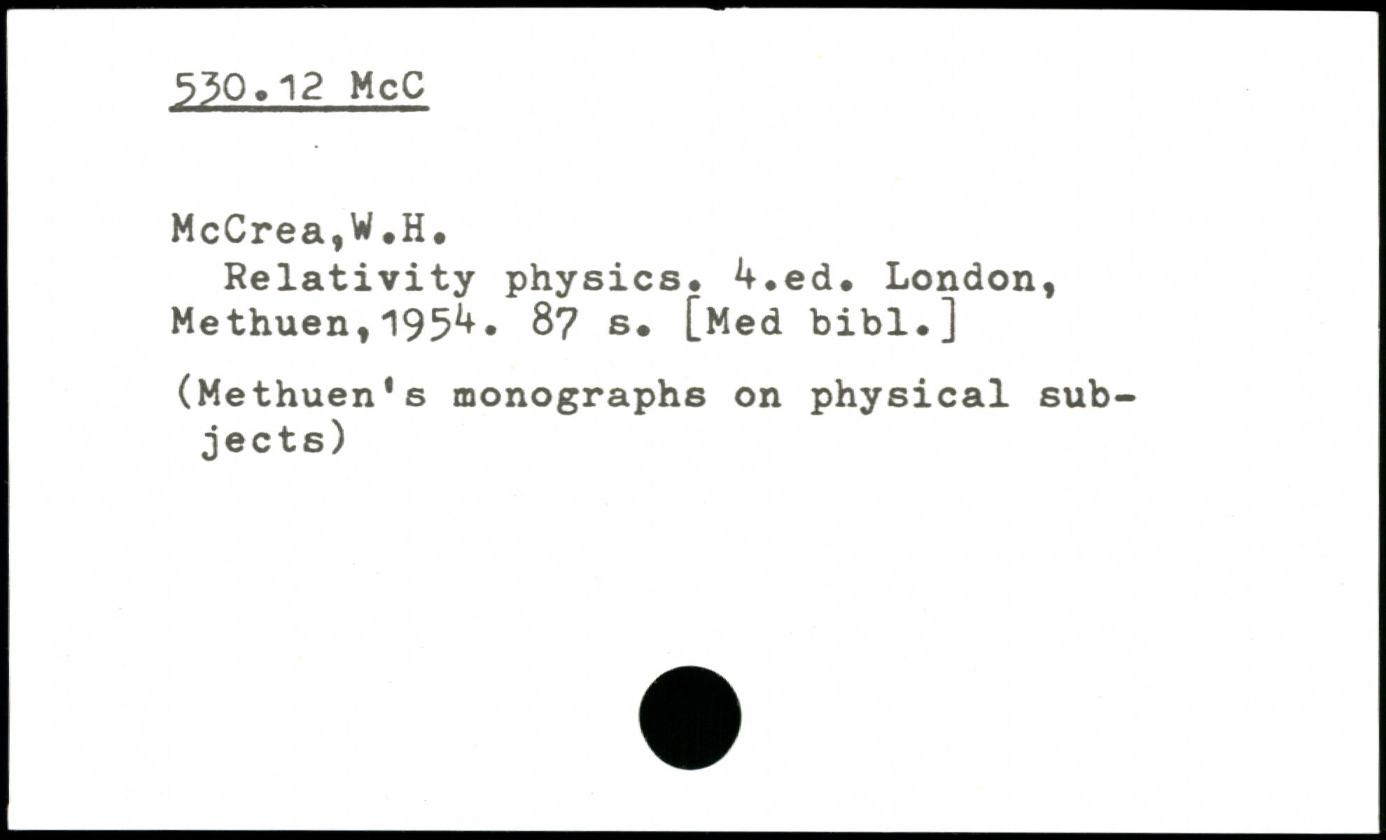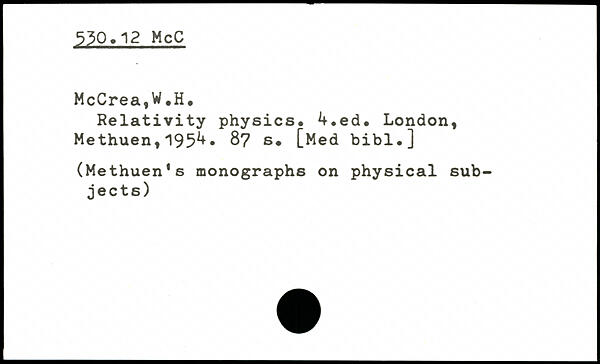 Relativity physics. ^.ed. London, Methuen,195^. 8? s. [Med bibl.]