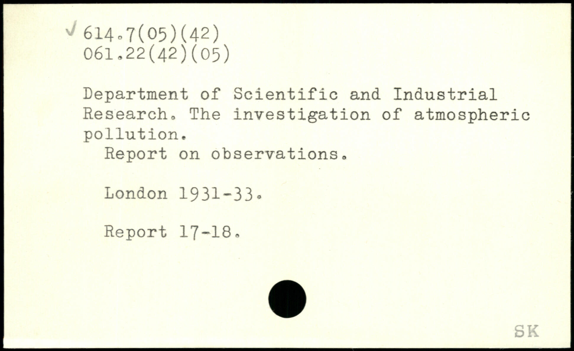 Department of Scientific and Industrial Research, The investigation of atmospheric pollution. Report on observations