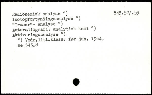 Radiokemisk analyse .) 543. 52/. 53 Isotopfortyndingsanalyse .) "Tracer"- analyse .) Autoradiografi ? analytisk kemi .) Aktiveringsanalyse .) .) Vedr.litt.klass, før jun. 19^4, se 545.0