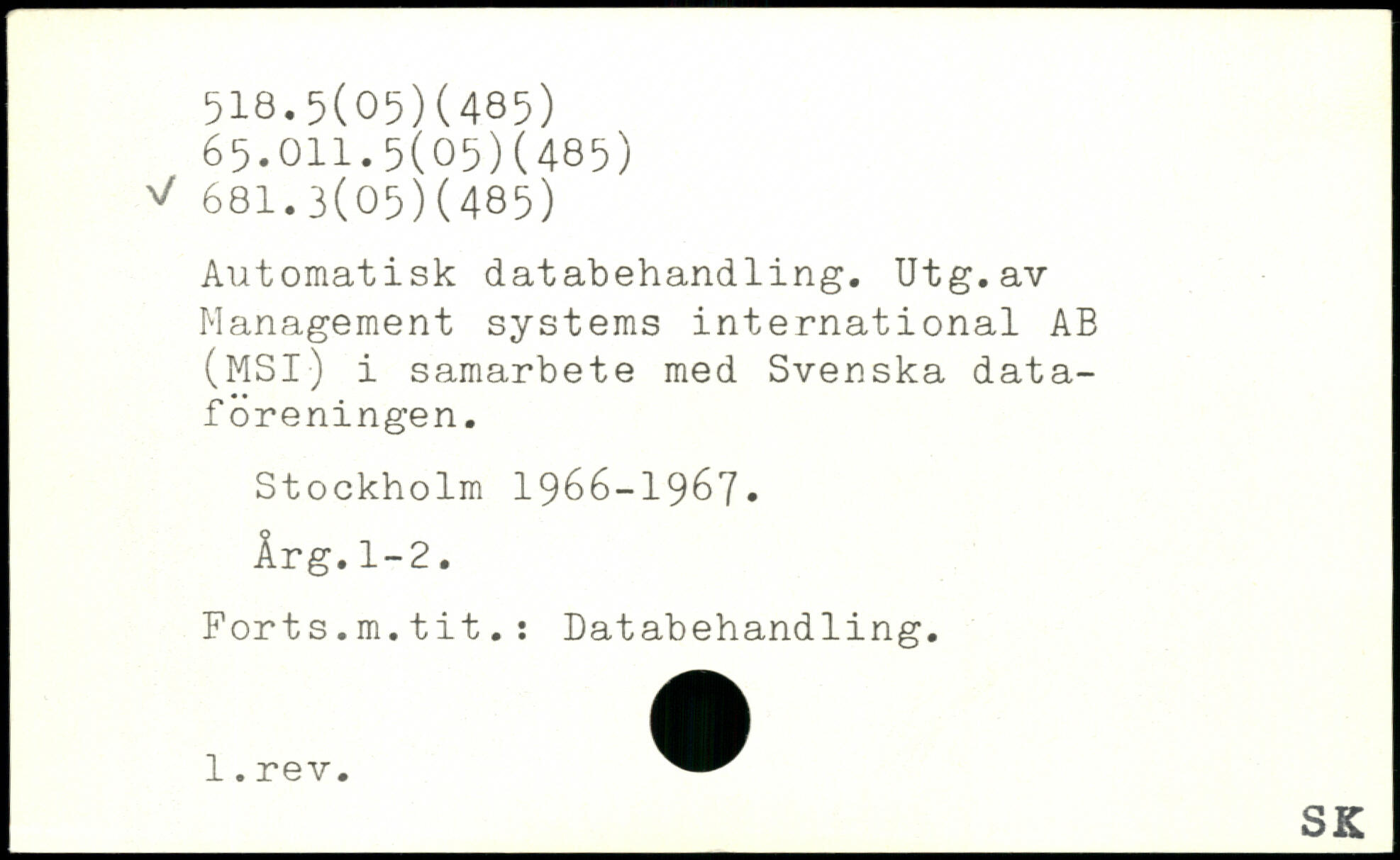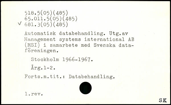 Automatisk databehandling. Utg.av Management systems international AB (MSI) i samarbete med Svenska dataföreningen.