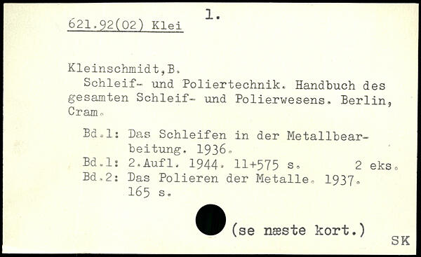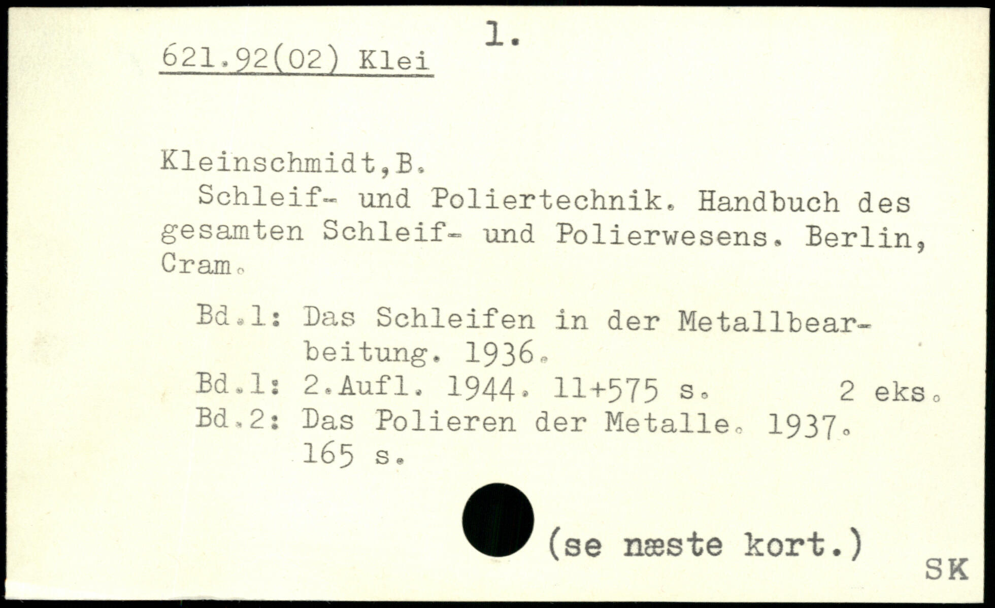b21,92(02) Klei Kleinschmidt,B, Schleif- und Poliertechnik. Handbuch des gesamten Schleif- und Polierwesens, Berlin, Crain, Bd.l: Bas Schleifen in der Metallbearbeitung, 1936, Bd-ls 2.Auf1, 1944, II