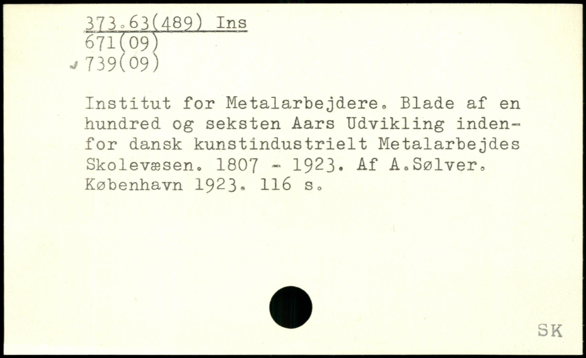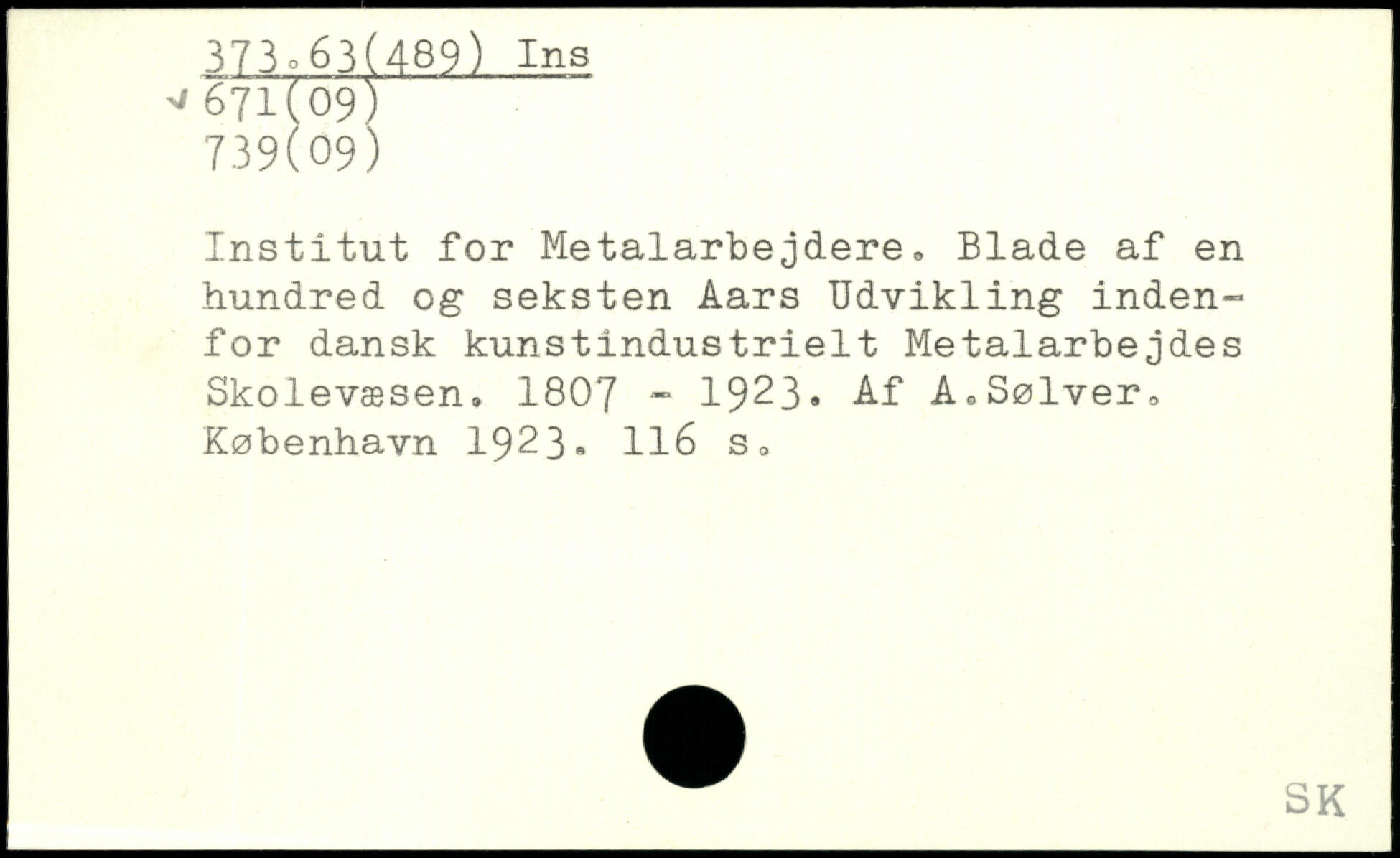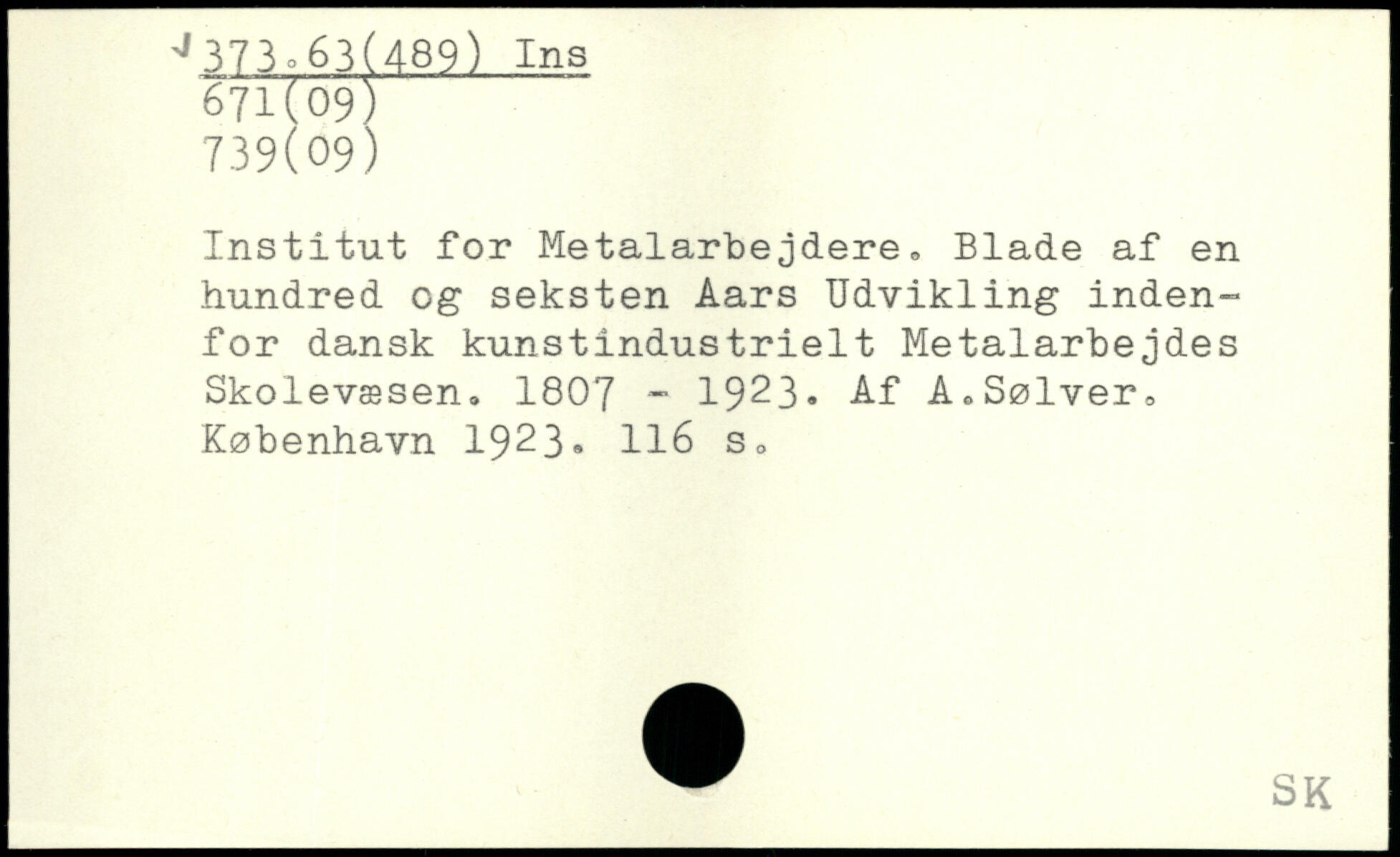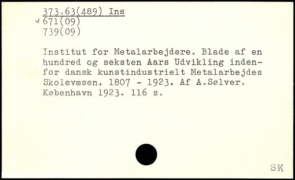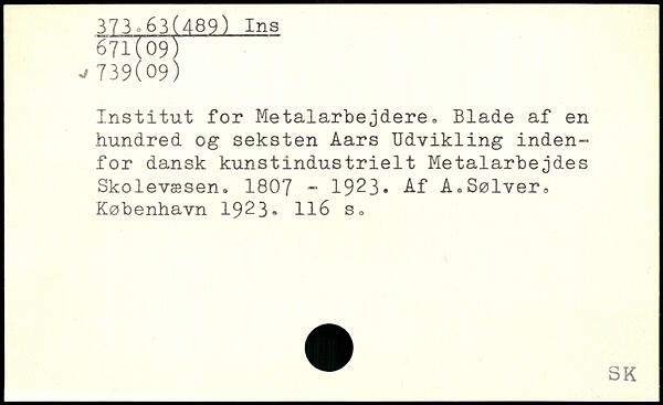 Institut for Metalarbejdere, Blade af en hundred og seksten Aars Udvikling indenfor dansk kunstindustrielt Metalarbejdes Skolevæsen, 1807 - 1923. Af A.Sølver